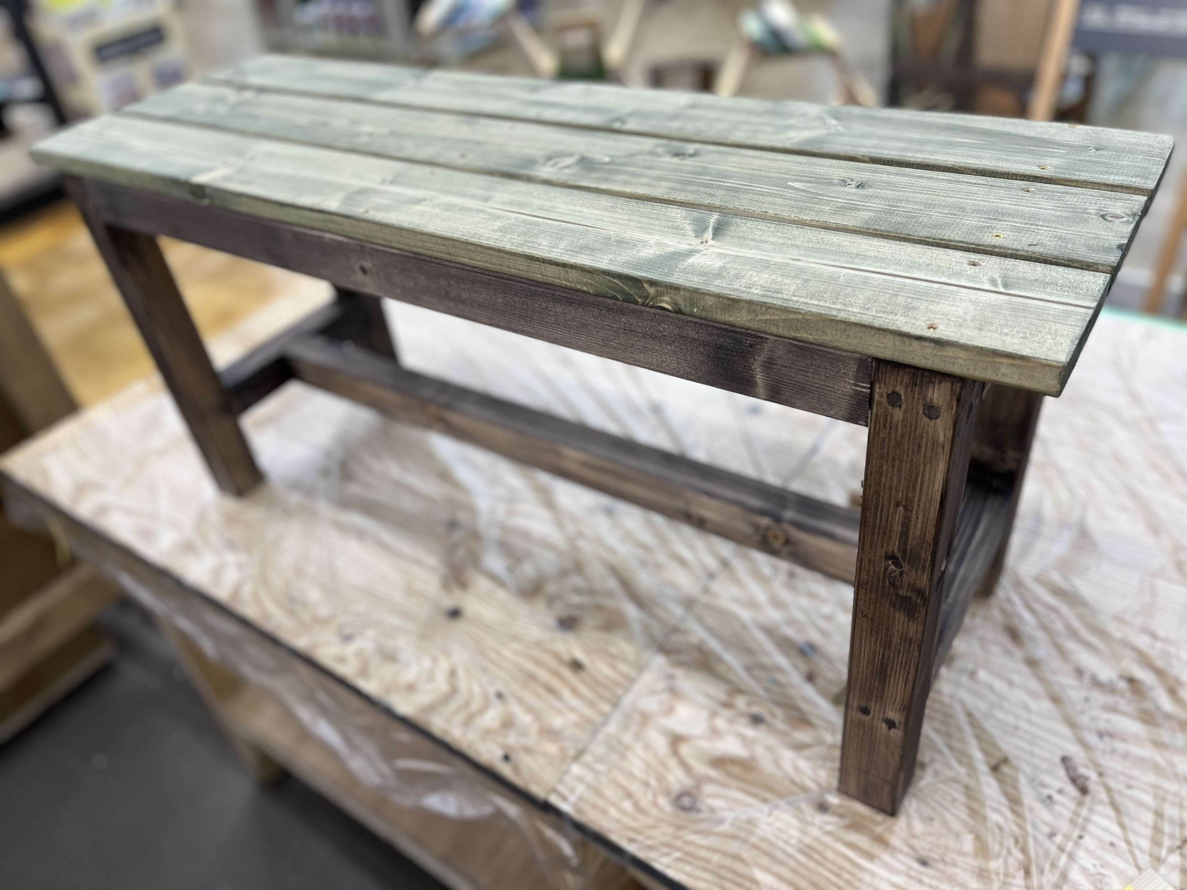他で買った同じようなベンチに(白木だったので)自分で塗装して使っています🎵