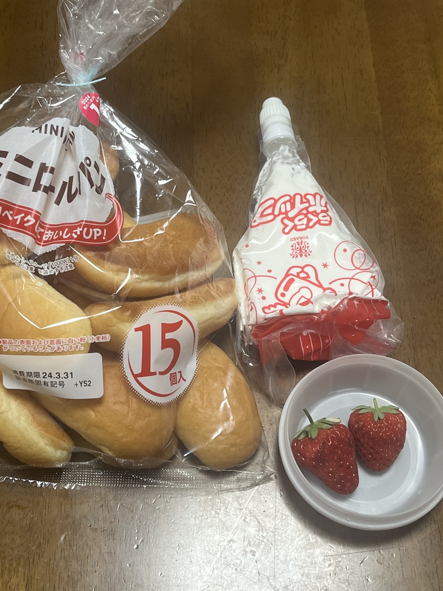 ②コッペパンにイチゴが挟まるように切り込 みを入れます。