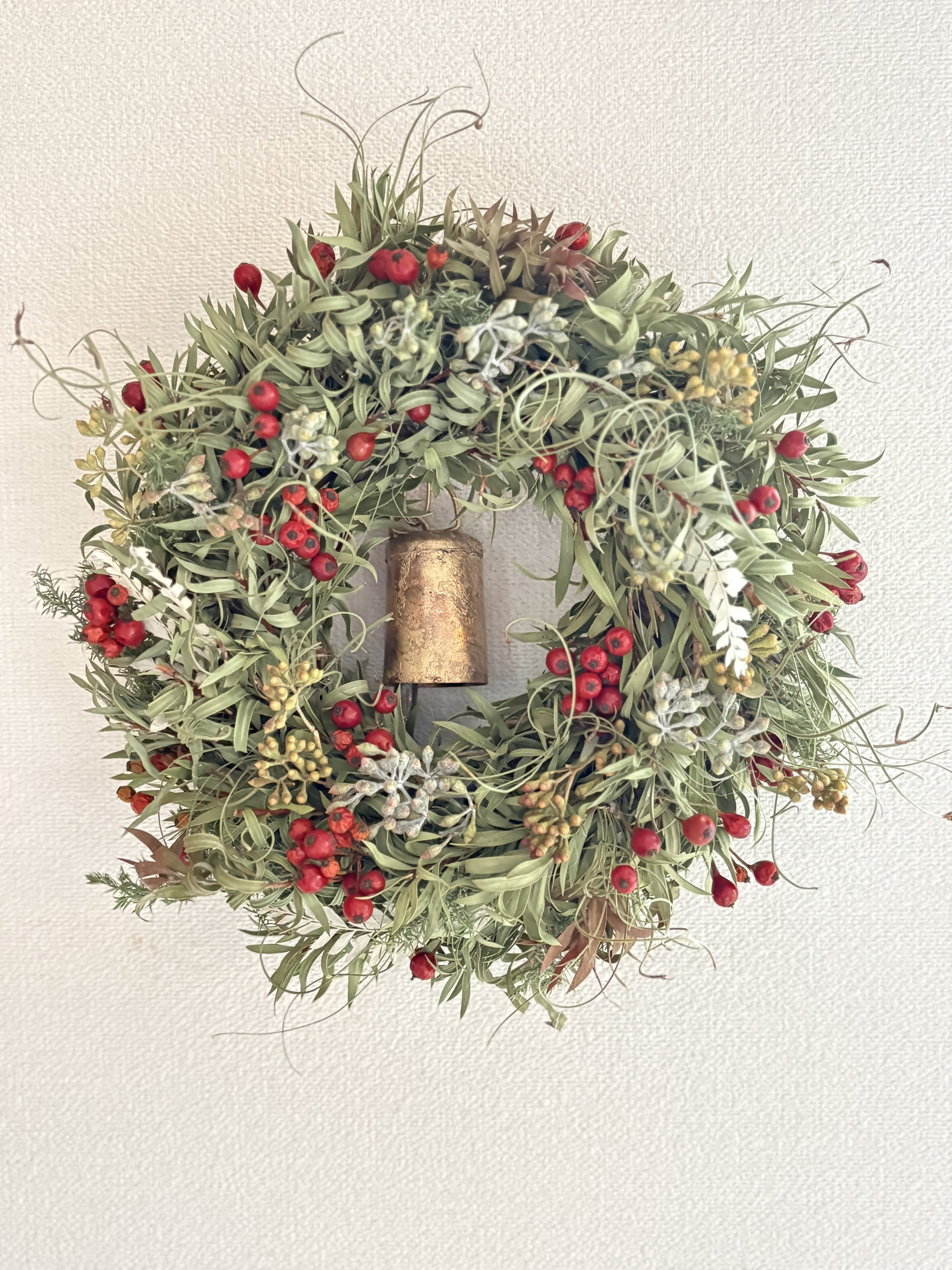 ドライフラワーの淡い色味に赤い実がアクセントになって可愛いです💕
