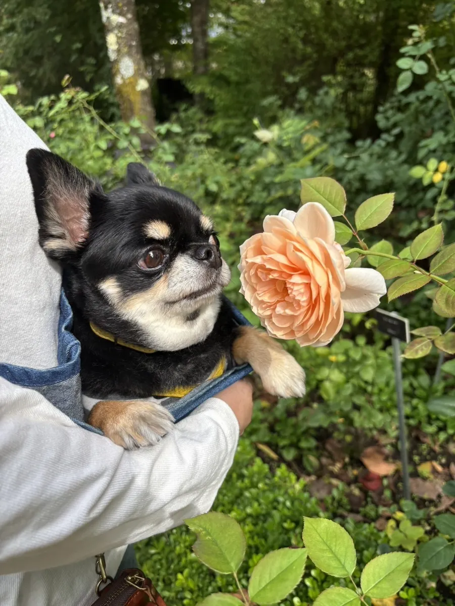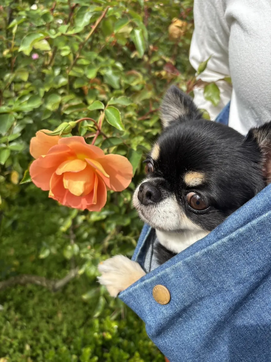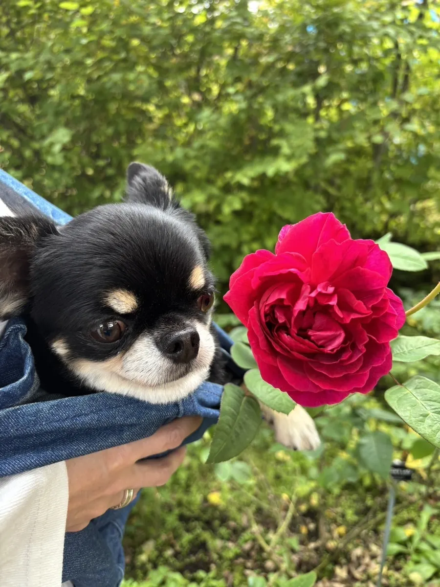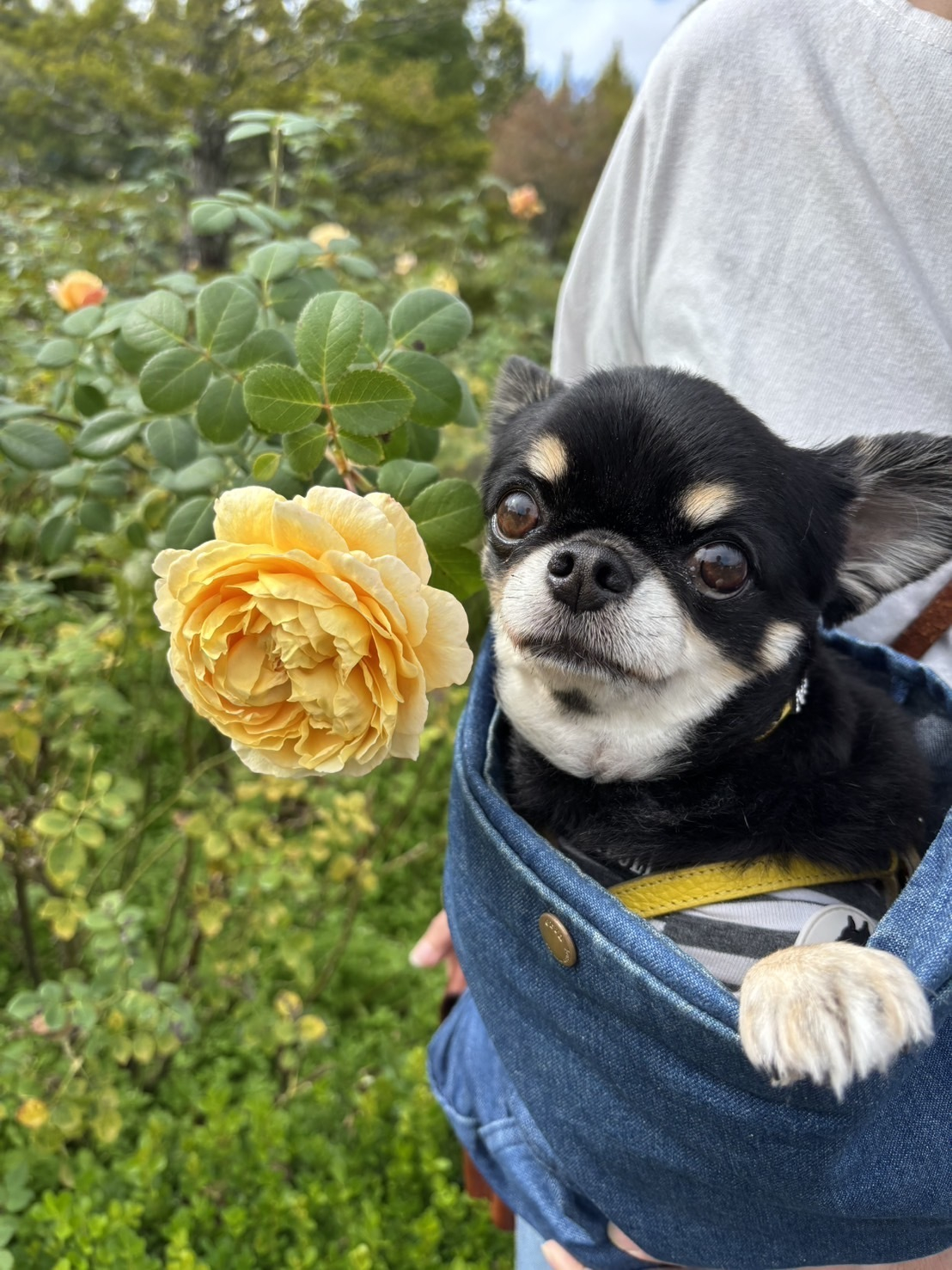花とのツーショットも絵になる可愛いワンちゃんですね💓