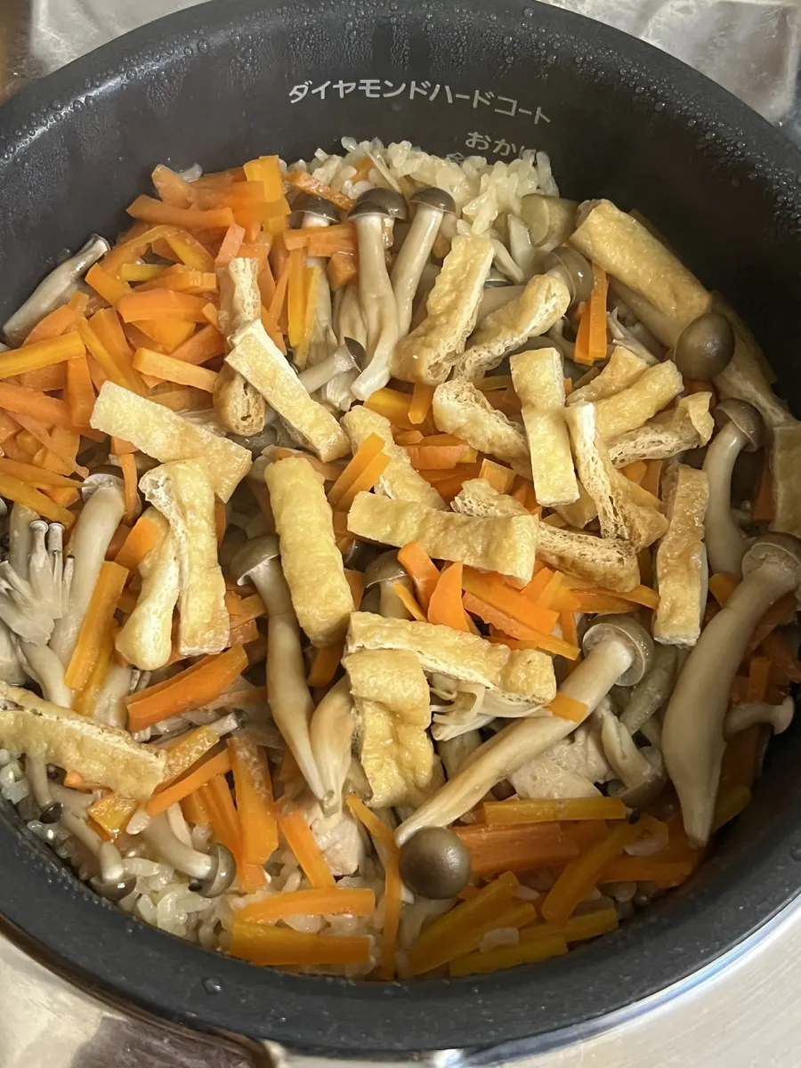鶏もも、人参、ごぼう、油揚げ、きのこ類などお好きな具材で❣️(個人的には鶏ももとごぼうはマストです🤭♡)