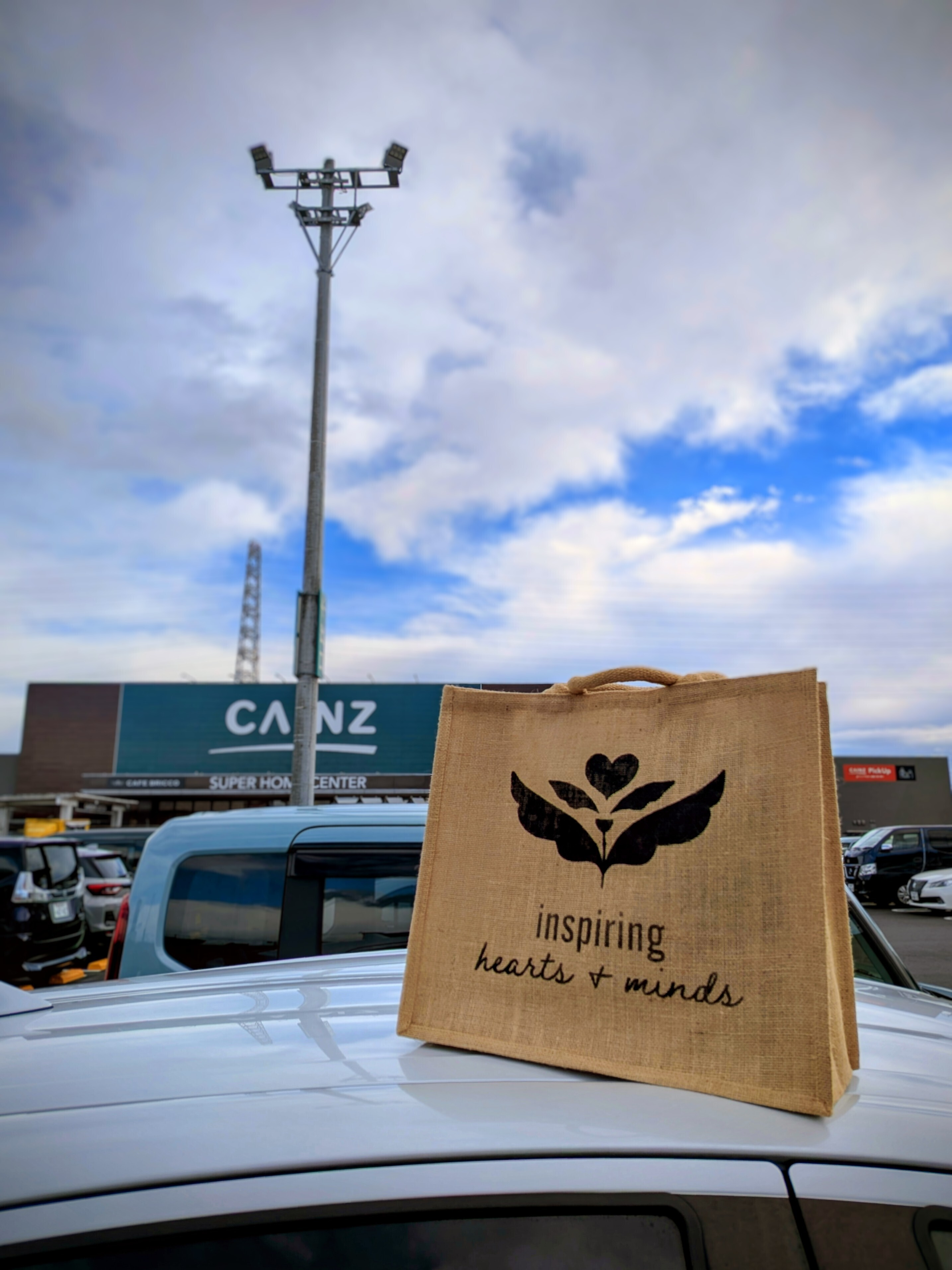 投稿を表示ジュートバッグと青空とカインズのコラボ素敵ですね✨ステンシルも綺麗😆