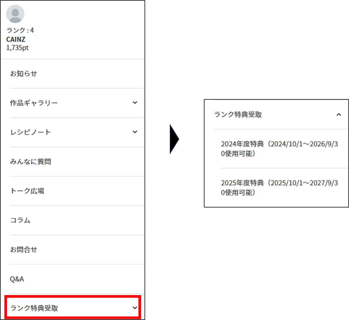 ランク3・4・5になると、「ランク特典受取」メニューが表示されるようになり、該当のランクに応じたクーポンの案内を確認することができます。