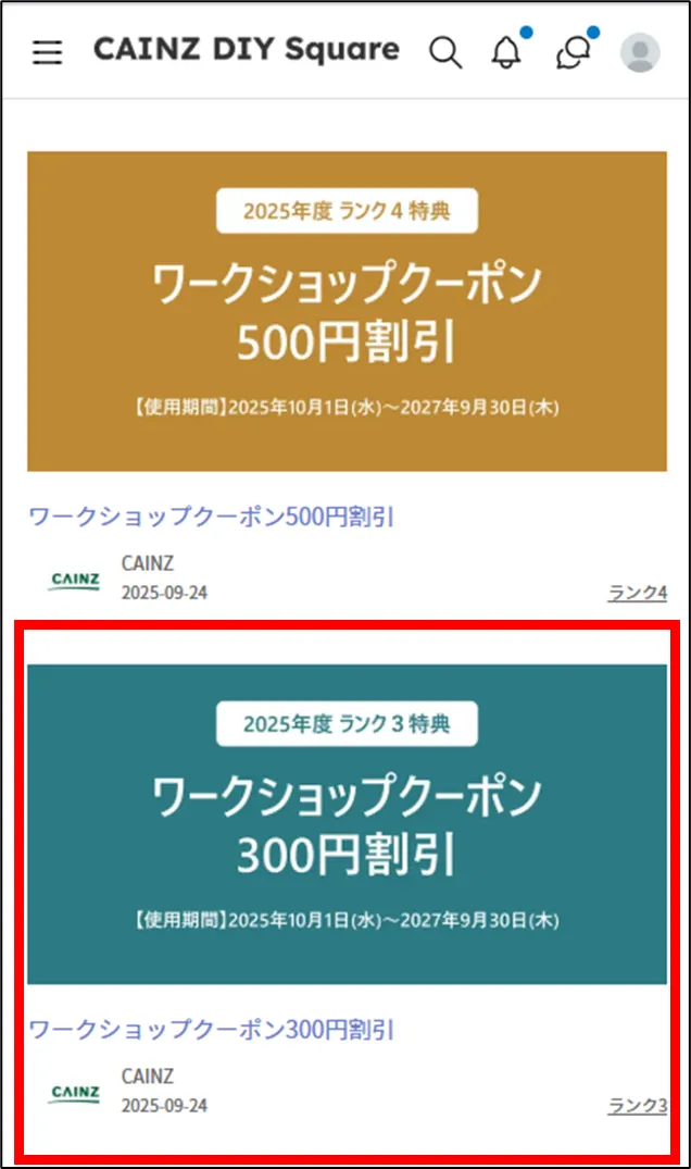 (1) CAINZ DIY Squareトップページ左上の三をタップ→「ランク特典受取」をタップ→使用したい特典の年度をタップ
