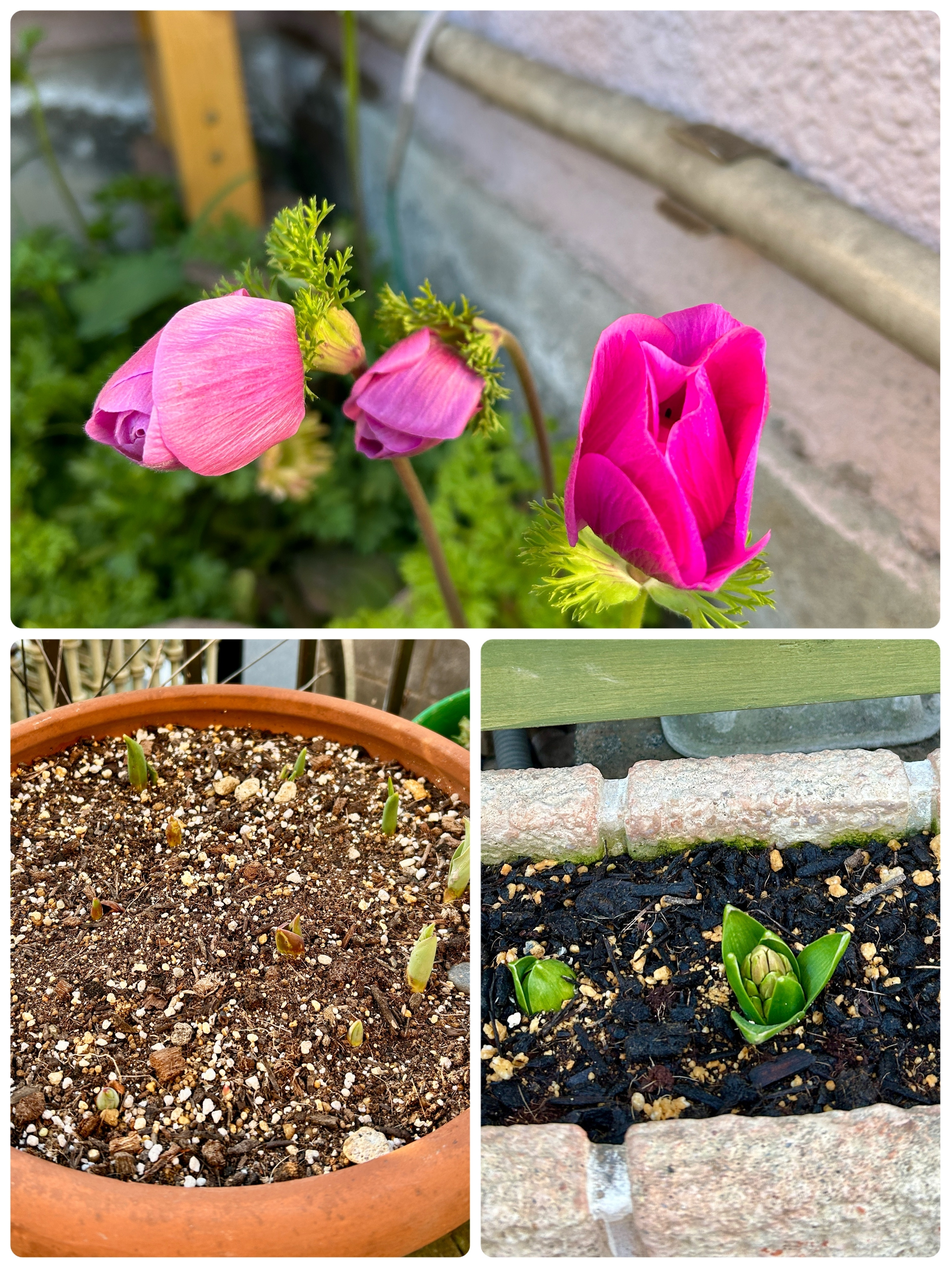 トップ > グリーン > 我が家の球根たちの今 Toko 2024/02/27 08:41 我が家の球根たちの今 昨年秋に植えた球根! アネモネは茎がどんどん伸びてきて、花が咲いてます。(多分…昼間うちにいないので見られない😓)、チューリップはまだ芽が3センチくらい…まだまだです。 最近ヒヤシンスが🪻芽を伸ばしてきて、花もちょこっと顔を出してます。 水栽培のヒヤシンスが終わる頃には、こちらの方が咲いてくれるかなぁと楽しみにしてます。 球根のいいところは、毎年必ず咲いてくれることですね…春の訪れを一番最初に教えてくれる。 いいね 共有する 共有する X LINE リンクをコピー コメントする 1 件の返信 (新着順) ミュートしたユーザーの投稿です。 投稿を表示 ひまわり 2024/02/27 13:37 本当にそのとおり、毎年おなじみの子(植物)が顔を出すと、あぁ~また春が来るんだねって嬉しくなりますね✨✨✨。 いいね 返信する