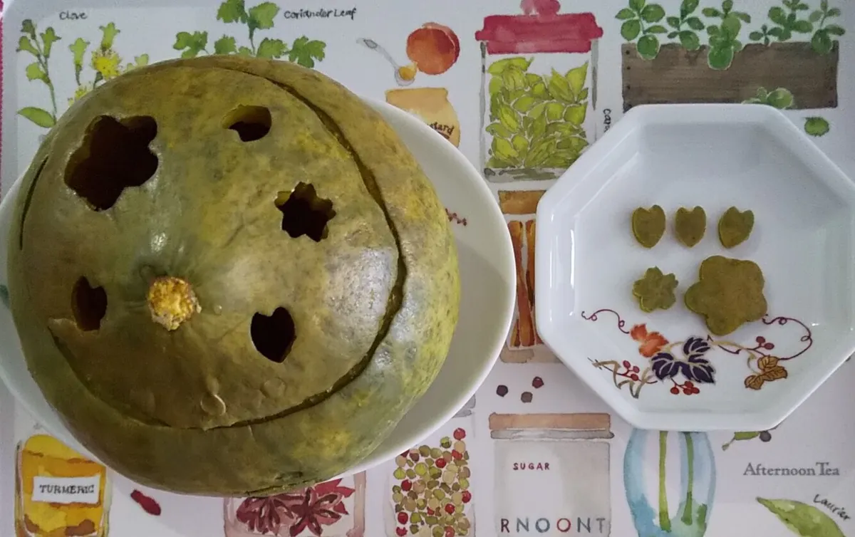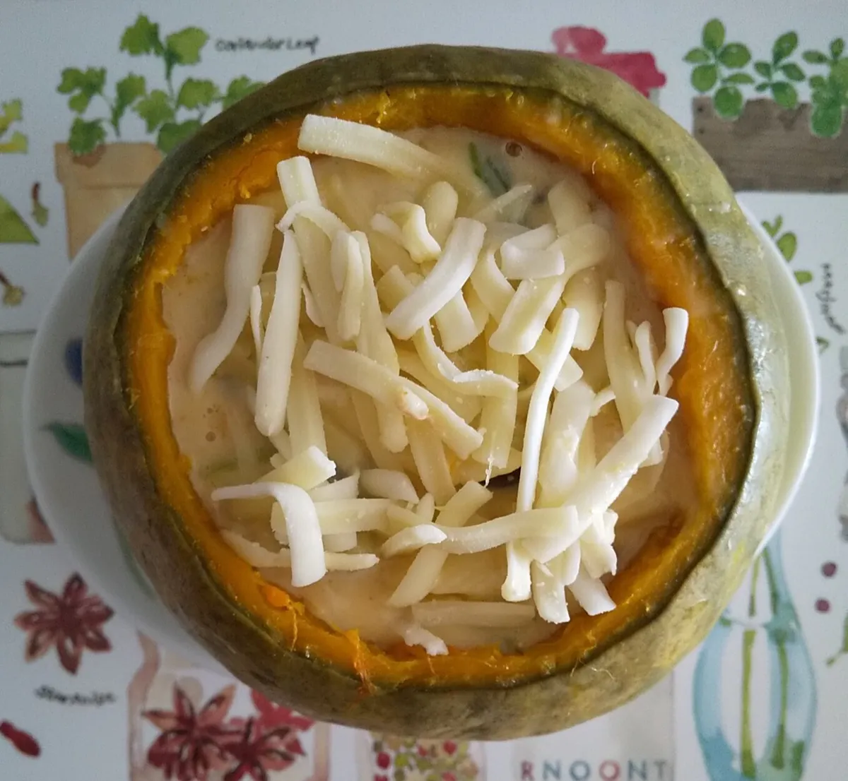 ⑥かぼちゃに注いで、ピザ用チーズ10gをかけ200℃のオーブンで様子を見ながら15分程焼く ![]() ![]() |