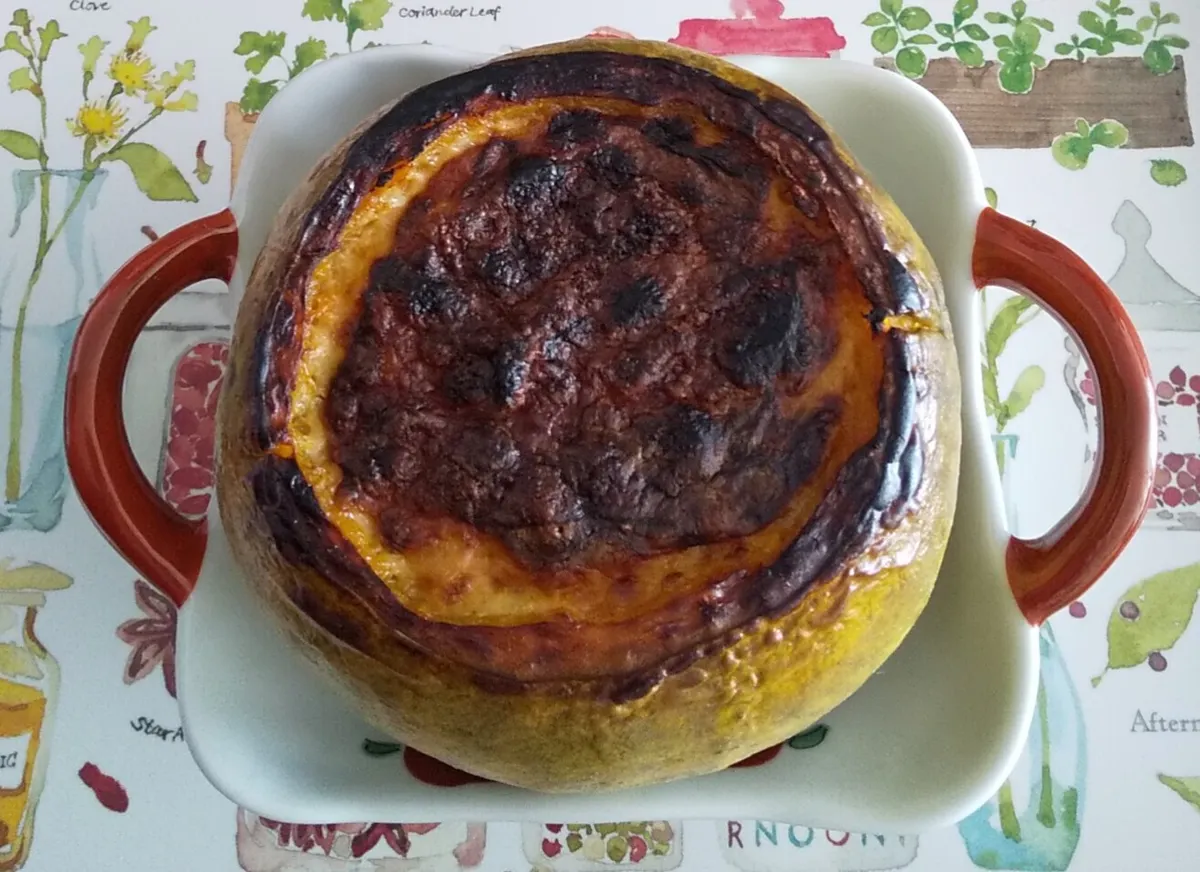 お正月のお野菜福袋の雪化粧🎃かぼちゃが綺麗でしたので、丸ごと使い、グラタンを作ってみました。