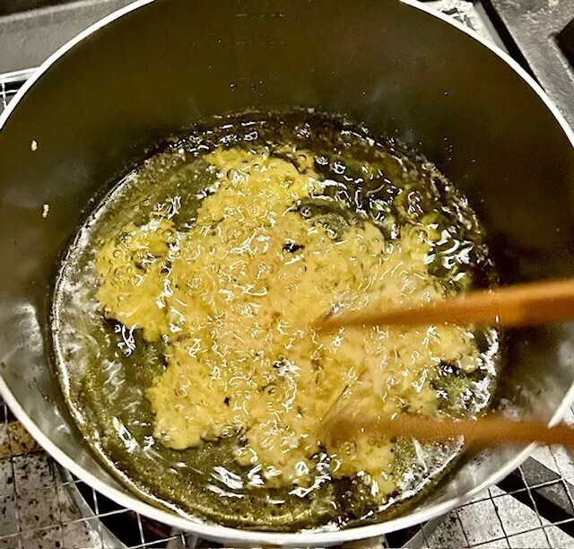 ③小鍋にオリーブオイル(アンチョビの缶詰のオイルでも可)を1センチくらいの深さに入れ、ニンニク(本当は薄い輪切りが良いんだけど、家にすりおろししか無かったのでこれでいきます)を入れたら弱火で薄く色づくまで炒め