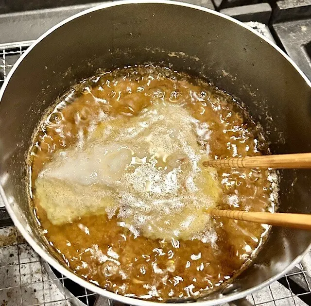 で、かさ増しの為にすりおろした玉ねぎとかパン粉とかみじん切りのナスとか色んなものを混ぜて作ってみたんですけど、長芋が1番ソースらしくなりました。