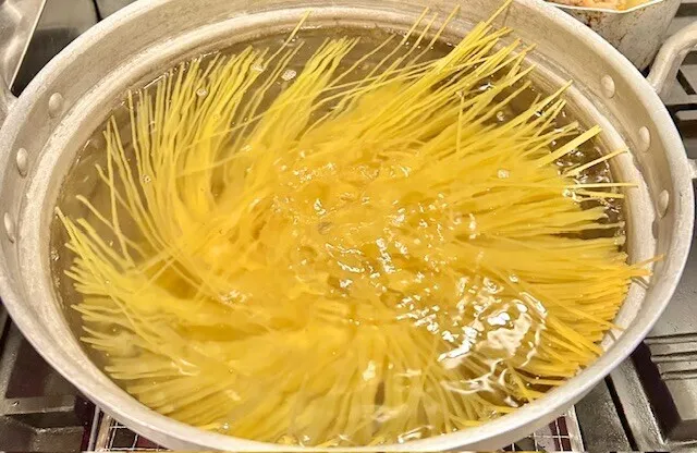 茹でたてのパスタと小口切りした葱を混ぜてからアンチョビソースを混ぜて出来上がり〜