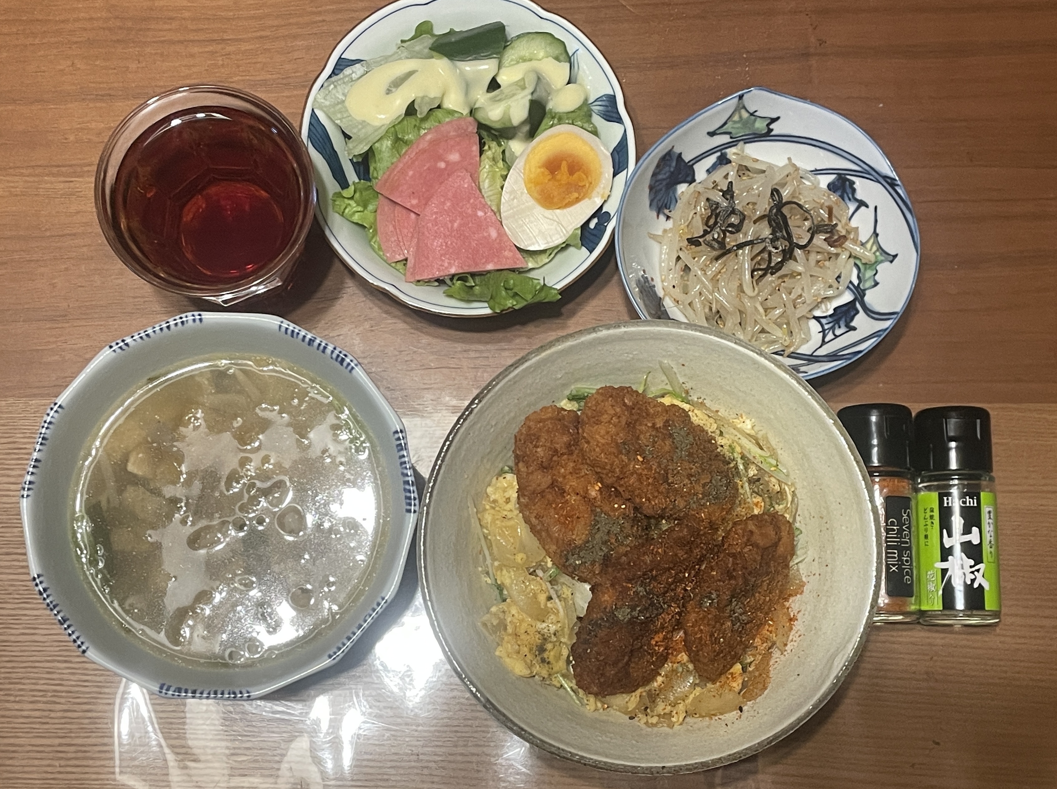 そなんで、この日の夕飯はお独り様飯だったのだがガッツリカツ丼も作ったし、雑サラダと元は国産牛小腸鍋かーらーのー謎味噌汁リメイクしまくってるのと頂いたよっ🤣🙌📸✨