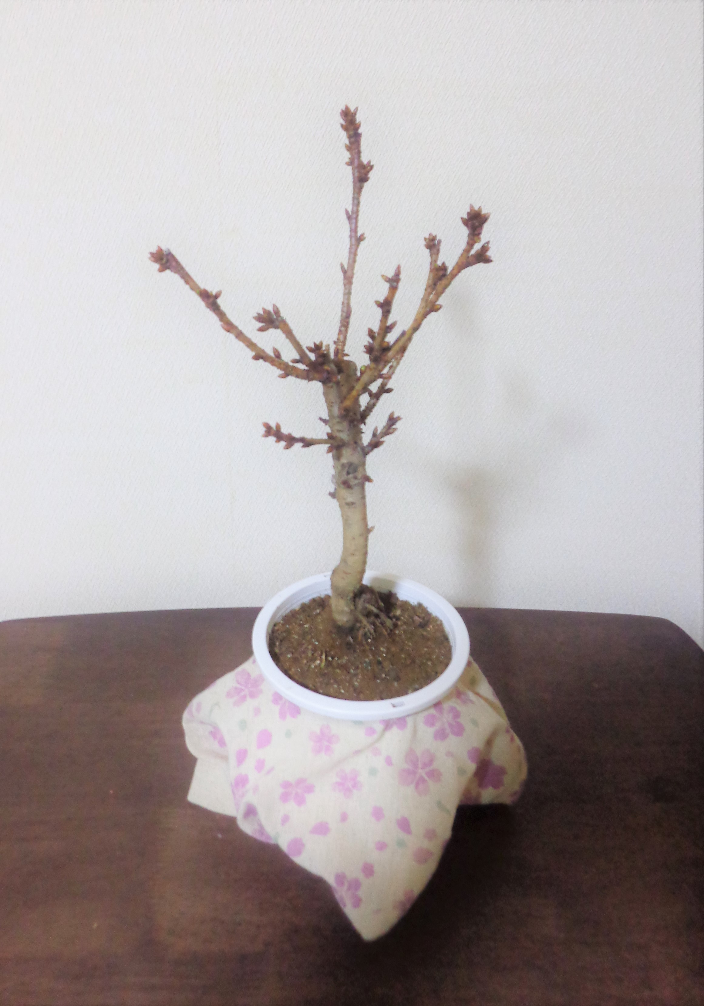 そして、私には桜の木が届きました。いつもお付き合いしている業者さんからいただいた物なのですが、まだつぼみにもなっていませんが、大事に育てて咲かせたいと思います。白いプラスチックの鉢だったのですが、これじゃちょっと味気ないかなと思い、なんかないかなぁと100均を探してみると桜柄のクッションカバーがあったので、これを買って、もこっとした感じで両面テープで貼っておきました。