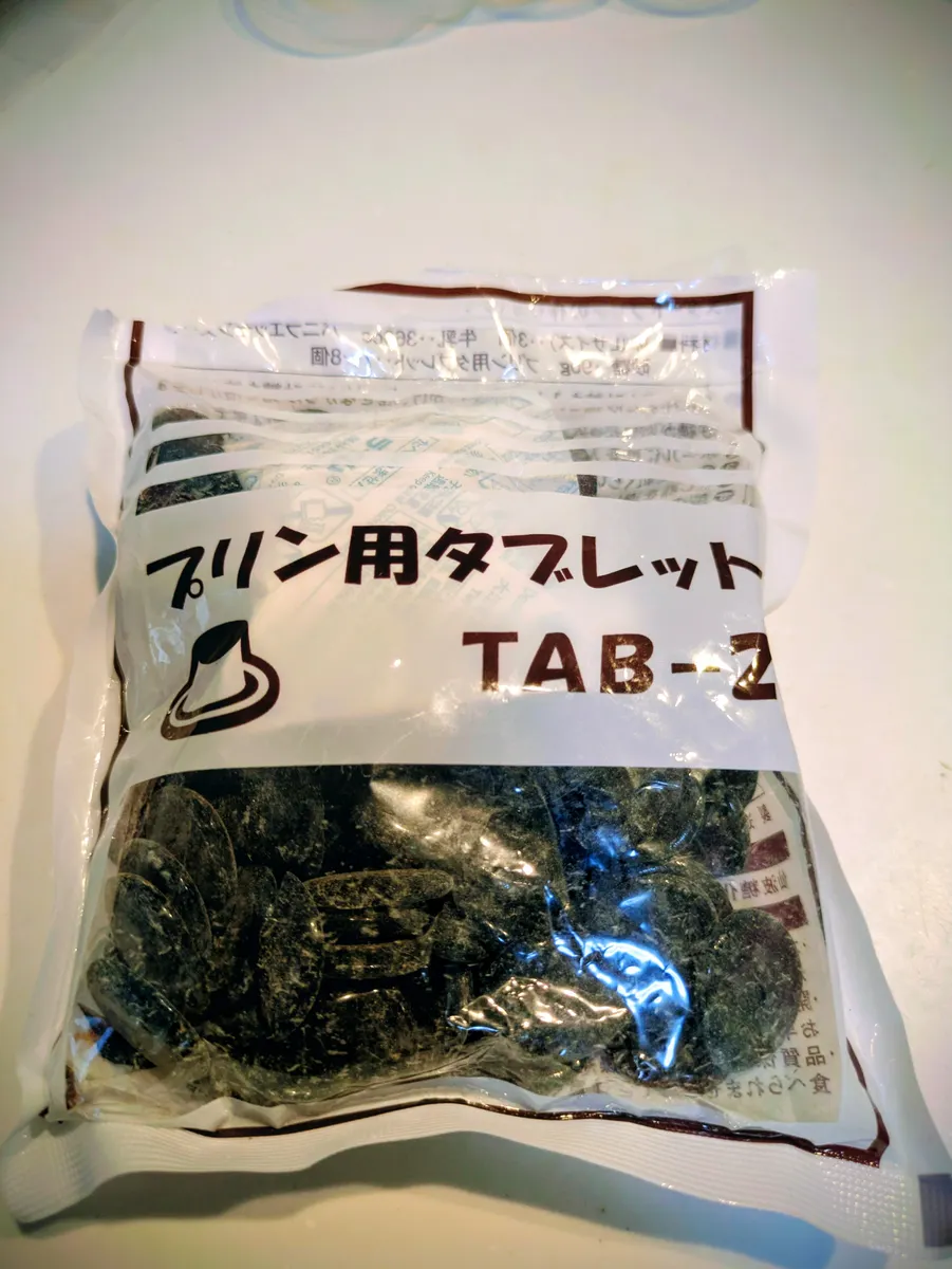 玉子…3個 牛乳…360cc バニラエッセンス少々 砂糖…90g プリン用タブレット…7〜8個