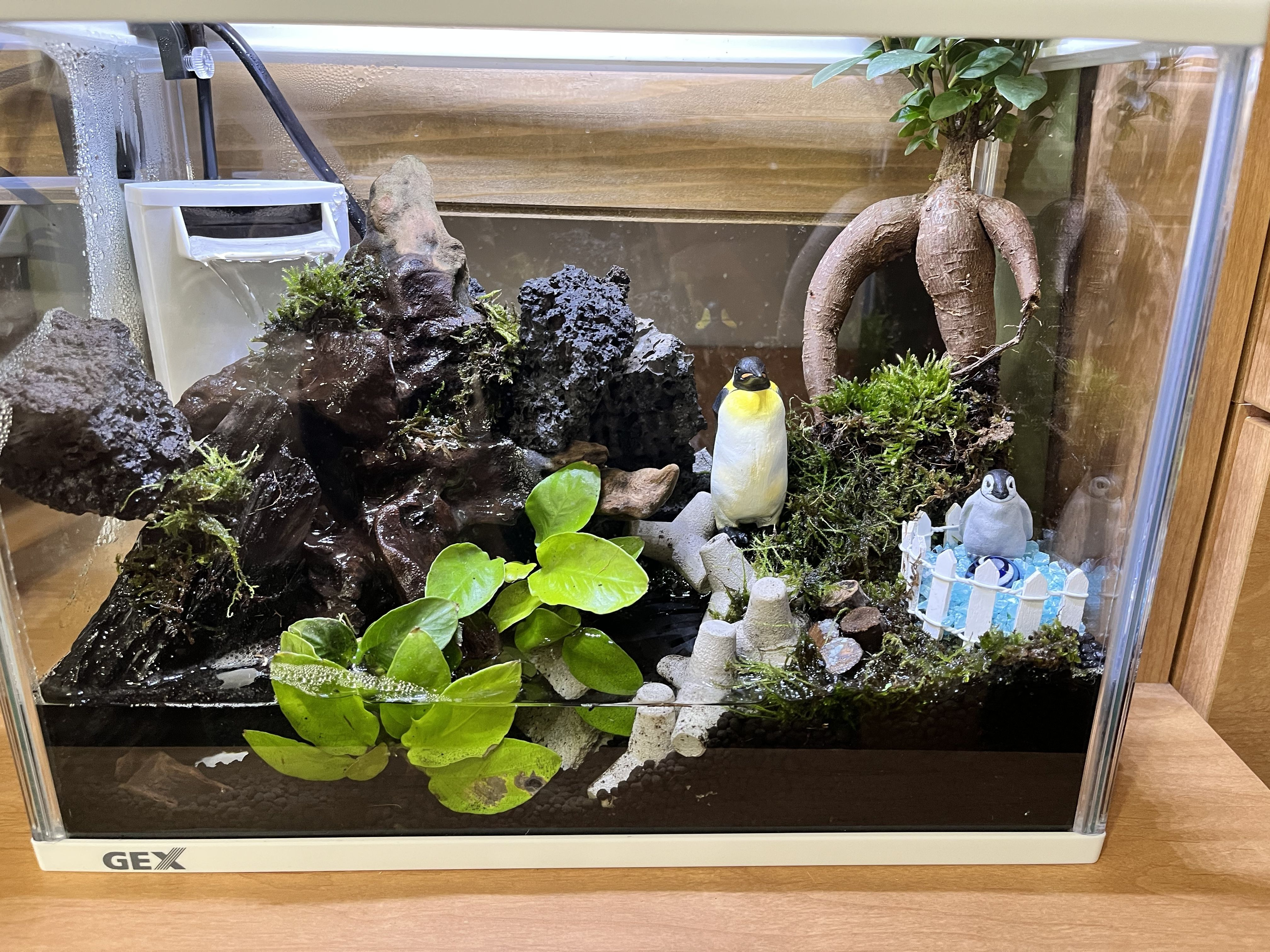 右の側面に鏡をくっつけるとペンギンが四匹に増えますょ、ガジュマル?も二本に……
