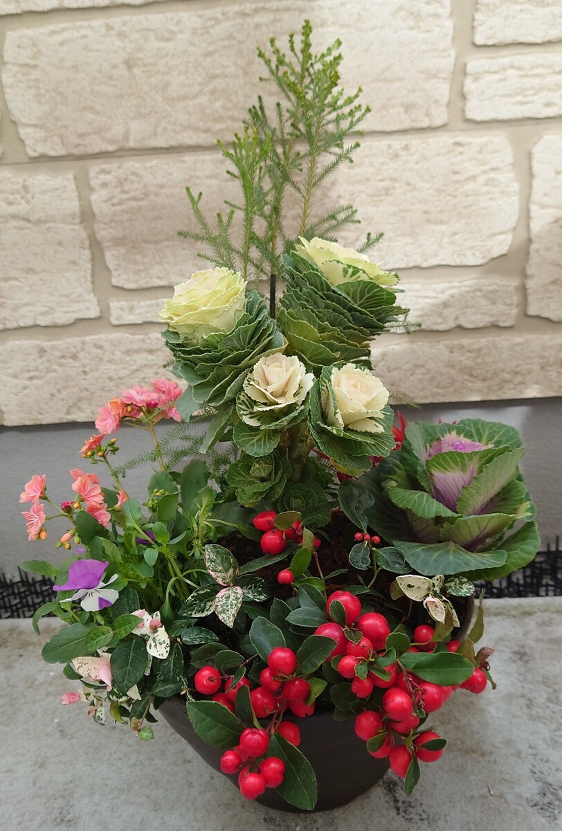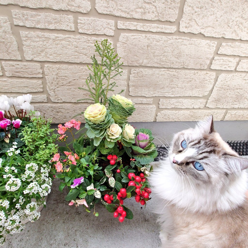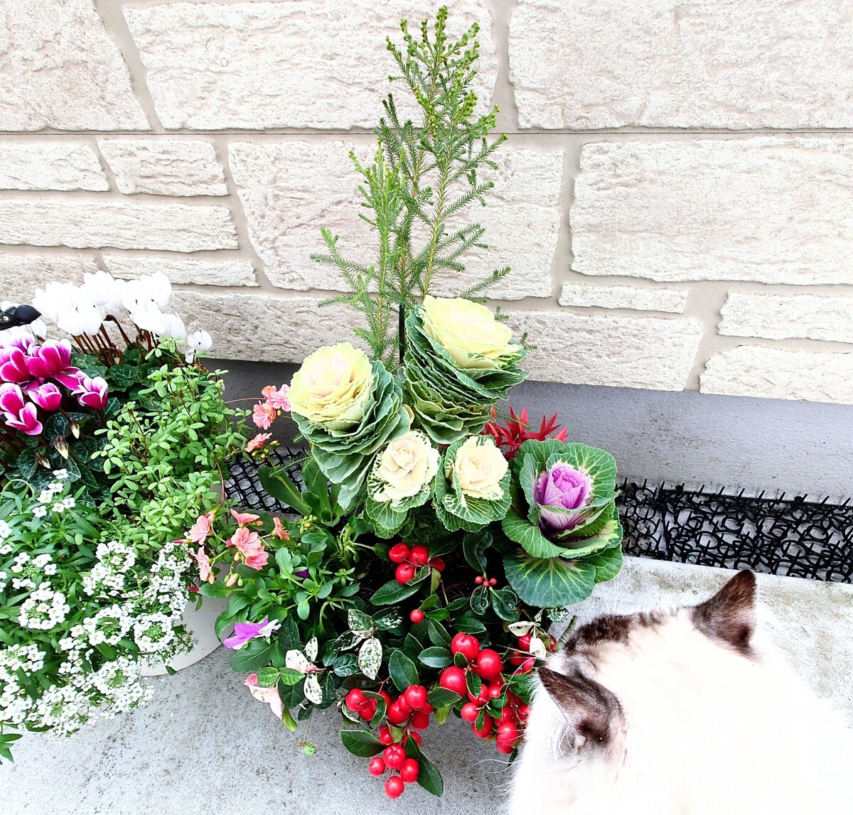 投稿を表示Rentoさん、こんばんは。🌠玲虎くんもお気になのですね😻!にゃんこは、🌹お花好きですものね。ボリュームのある豪華な葉牡丹に南天の葉が❣️✨チェッカーベリーが可愛さアップですね。素敵です🩷💞🌹(◕ᴗ◕✿)
