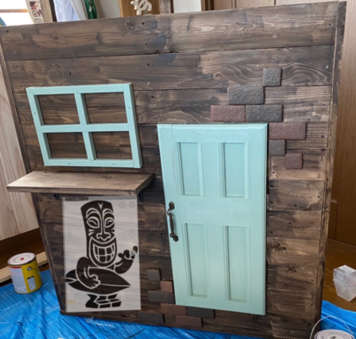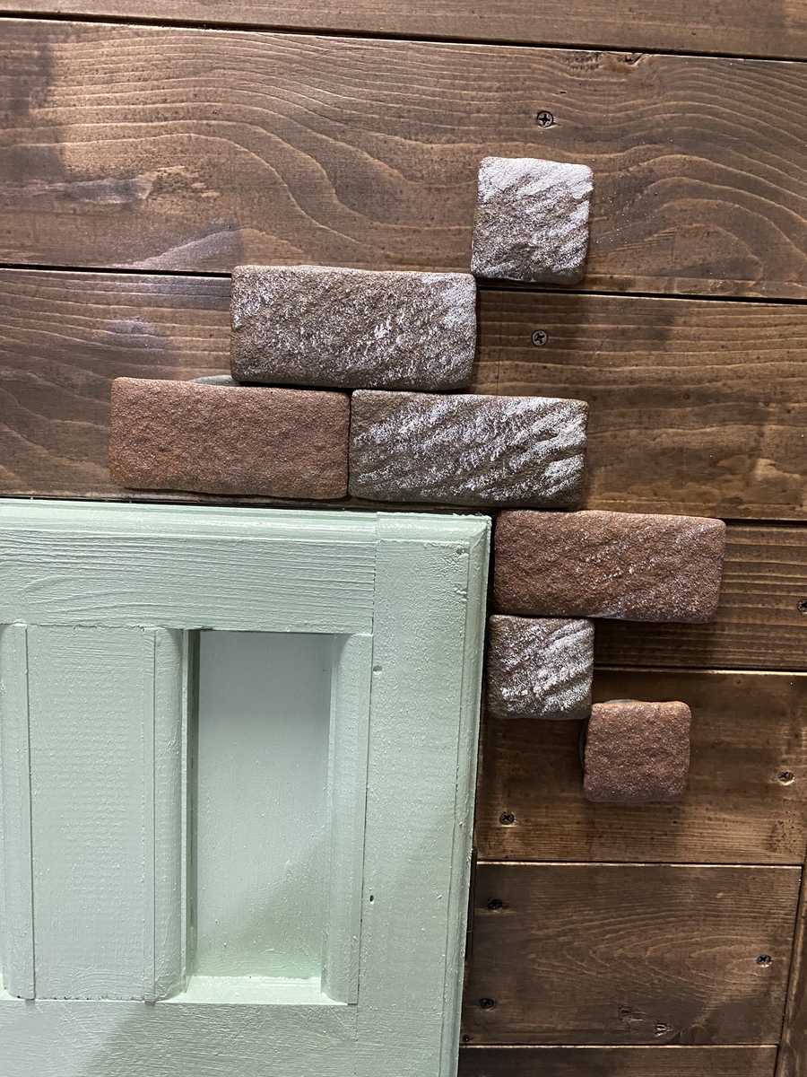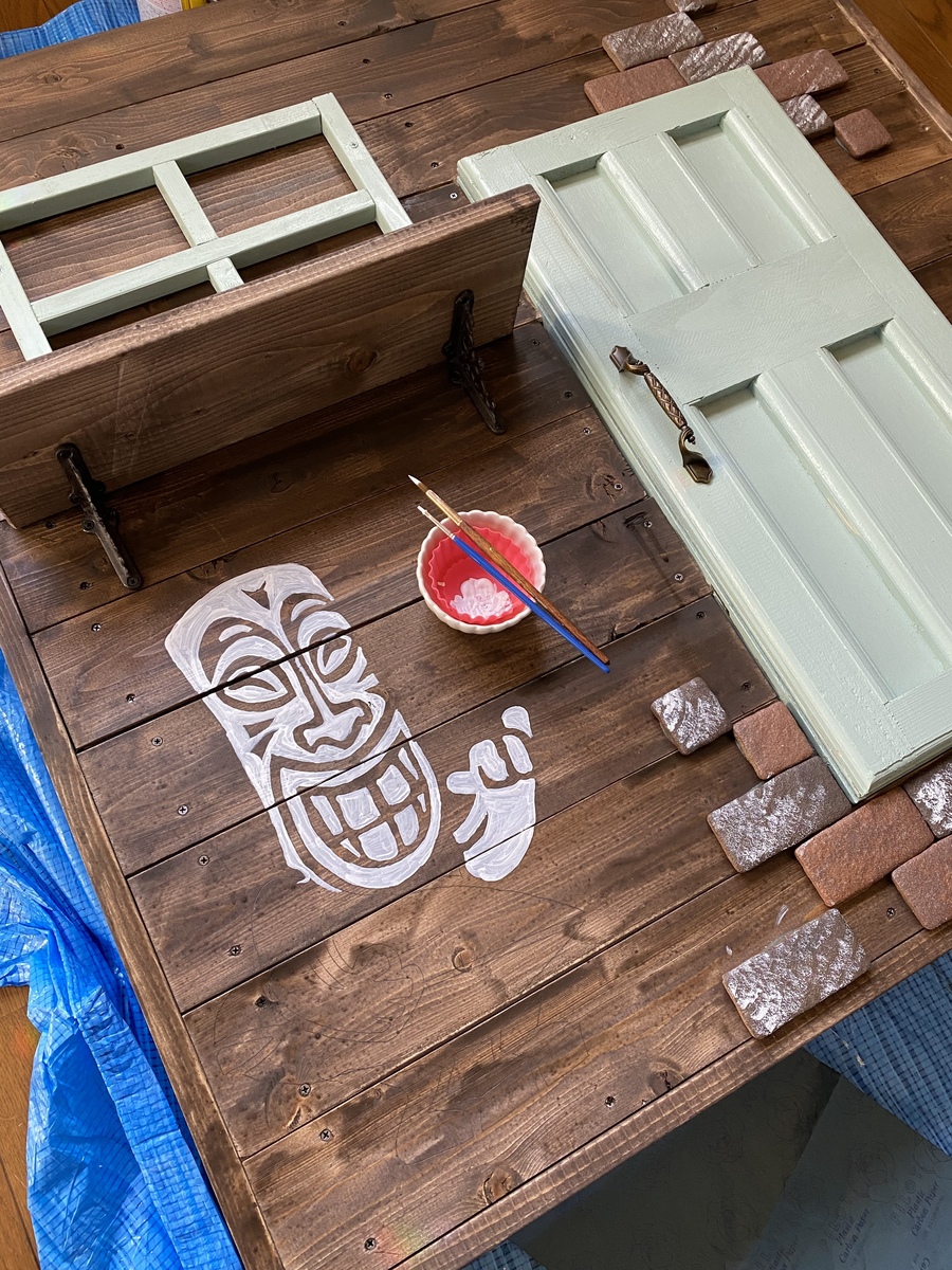 ファブリックレンガが目立たないのでペンキで汚してみましたよ。