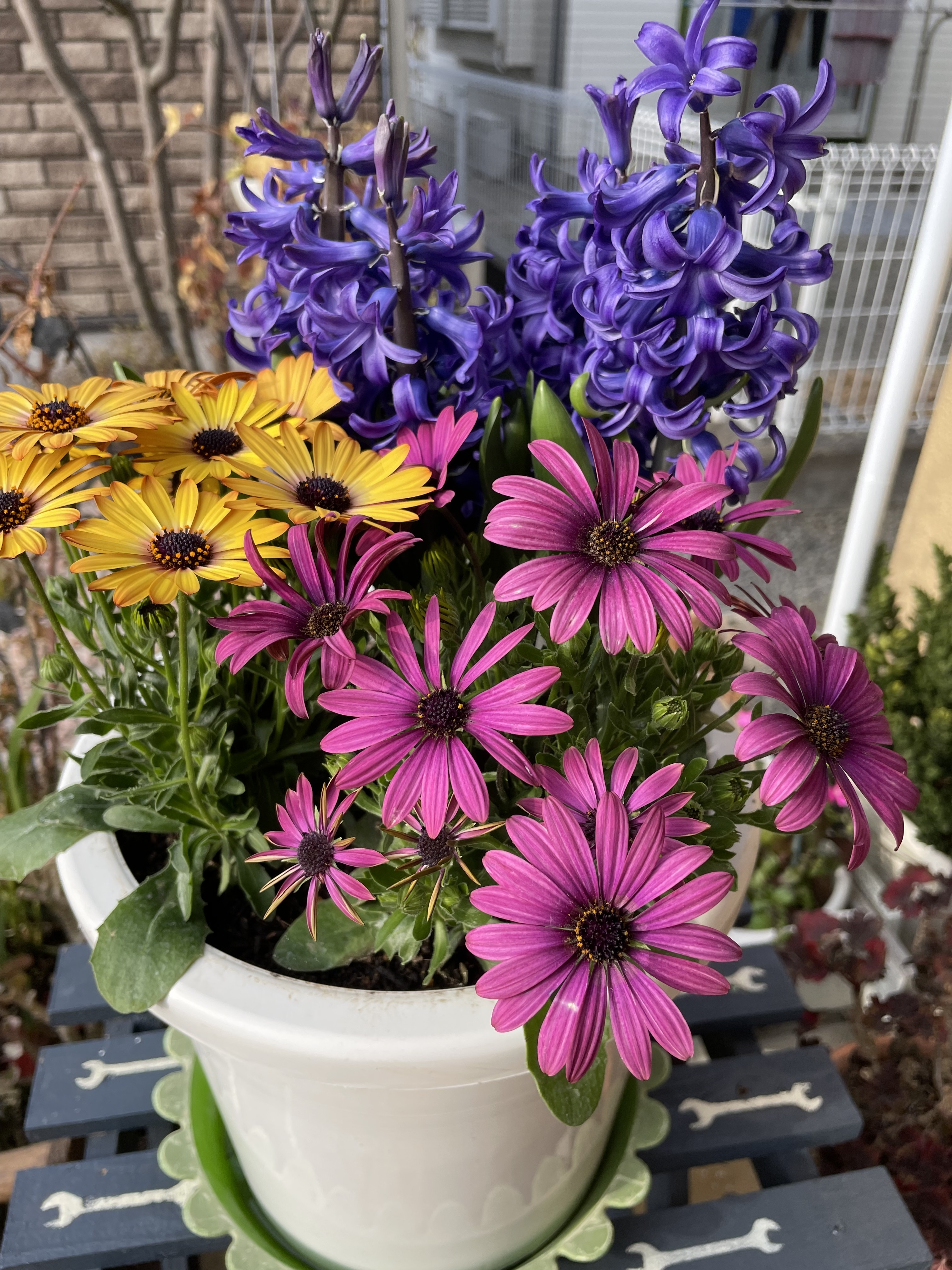 好きな種類のお花を寄せ植え出来るの、良いですね💕色のバランスが素敵✨