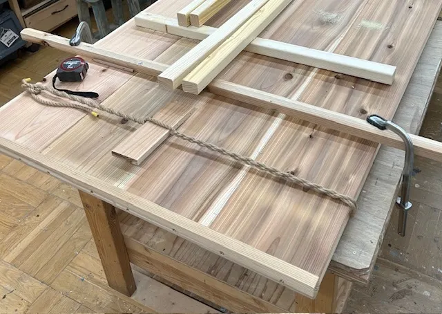 2000mmのカフェ板4枚を1500mmにカットして、木工用ボンドで接着、裏から30mm×40mmの角材を2本渡してビス止めしてあります。