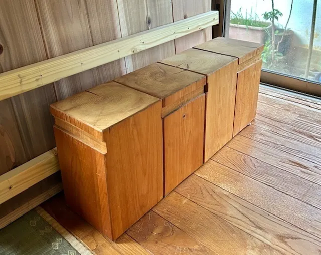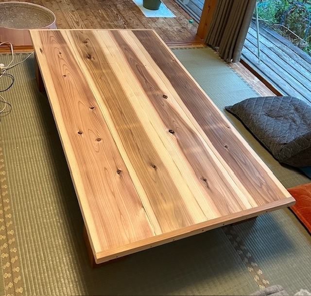 元々こういう脚が4本あるので⬇️それをこの2本の角材の間に来るようにはめたらアイキャッチのような座卓になるって計画。