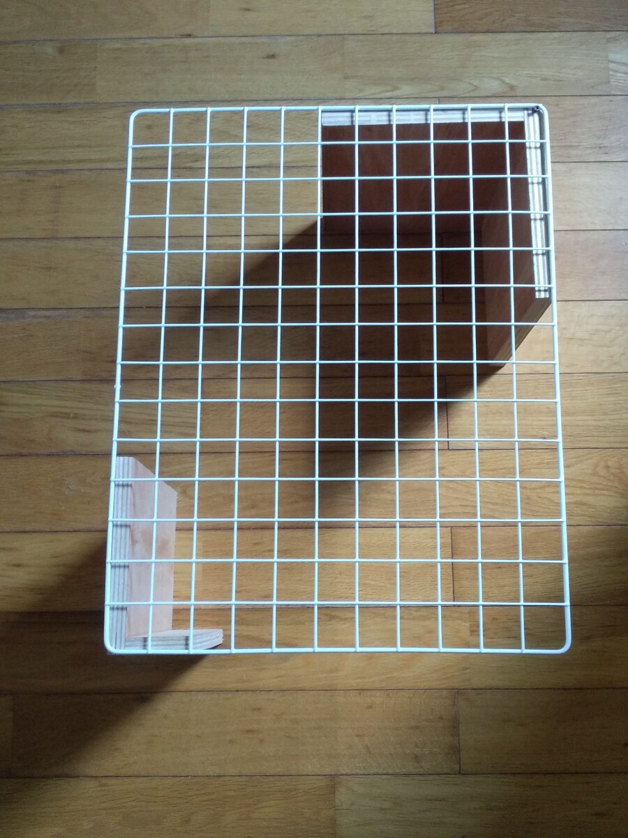 対角線にL字を作り、網を乗せて、網が外れないように一カ所釘を浮かせて打ち込みしました。
