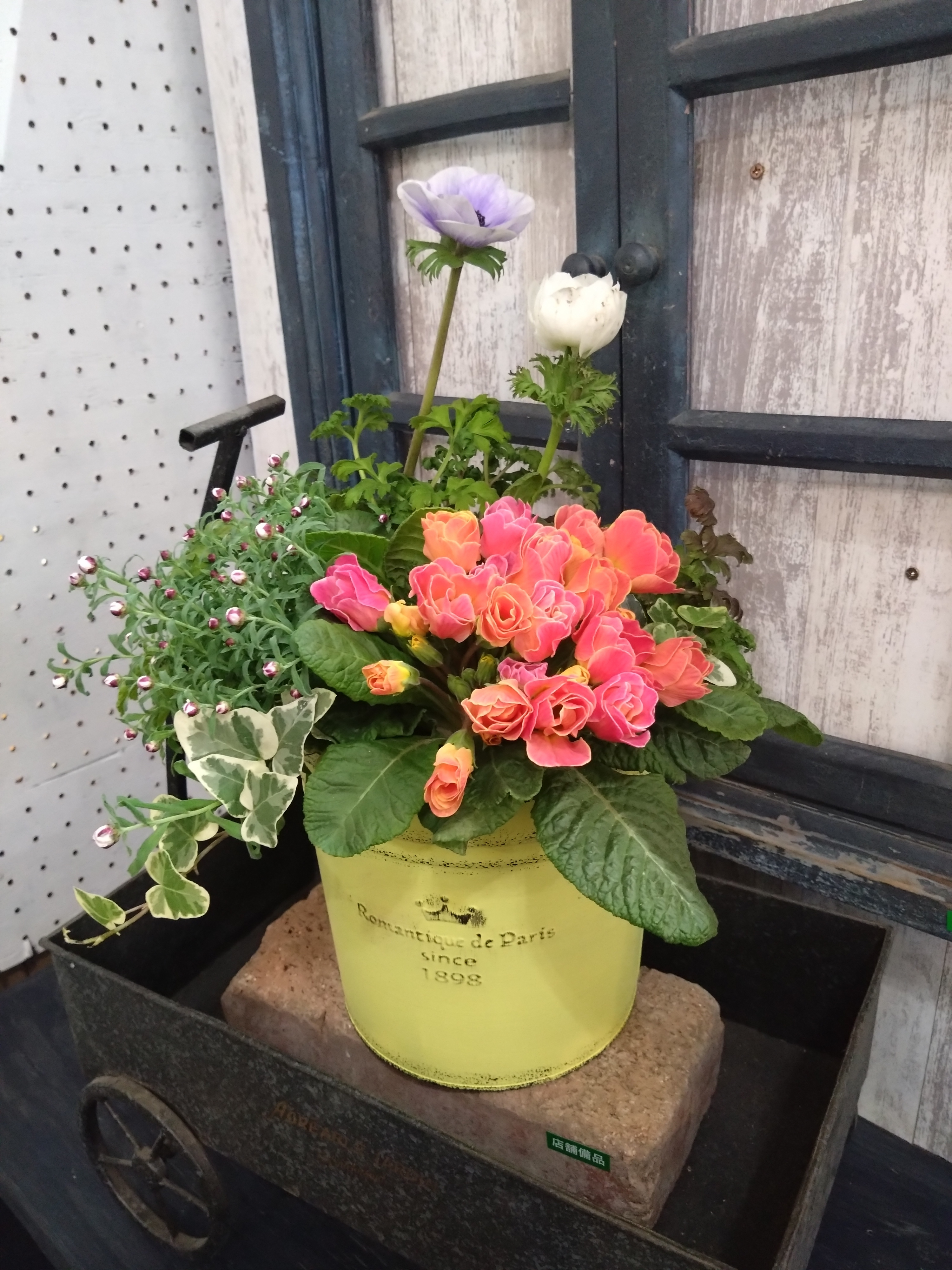 黄色の鉢にピンクのプリムラがとても映えて素敵です♪̊̈♪̆̈
