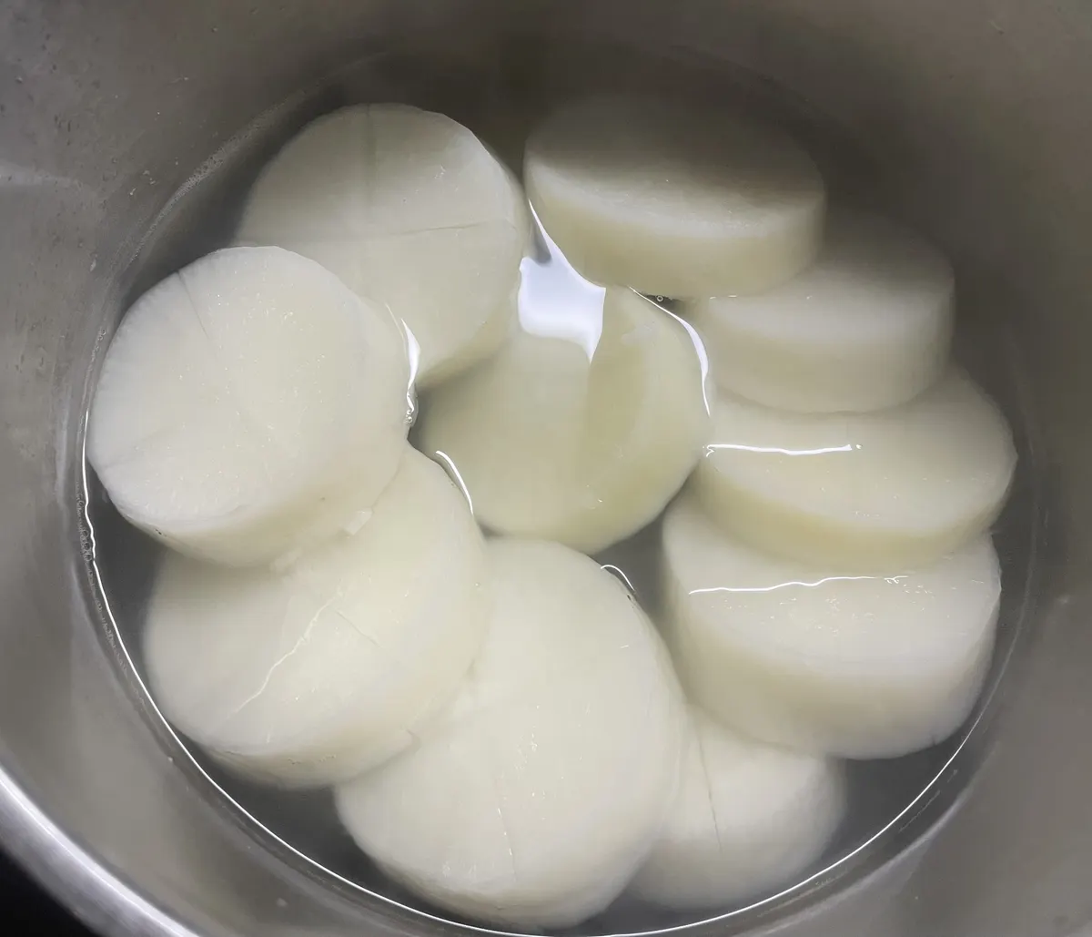 大根を厚さ3cm弱のデカい輪切りにし、隠し包丁を裏表共に十字に入れたら、米をひと摘み入れた圧力鍋で煮てゆくぅ〜⚪️🔪➰🌾🍲✨