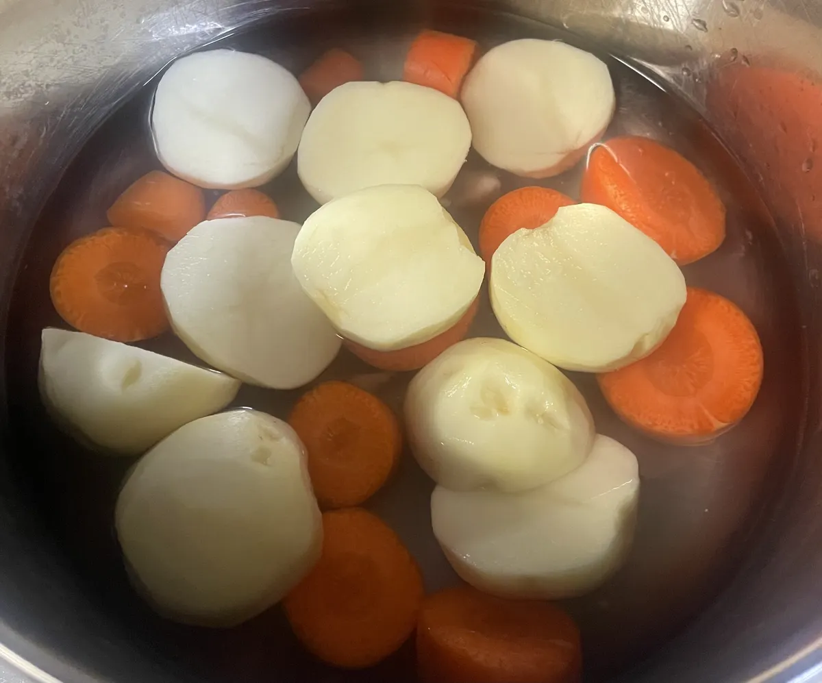 別鍋の寸胴に人参・じゃが芋をデカめカットしたのをスタンバイさせといてぇ〜🥕🥔🔪➰🍲‼️💨✨