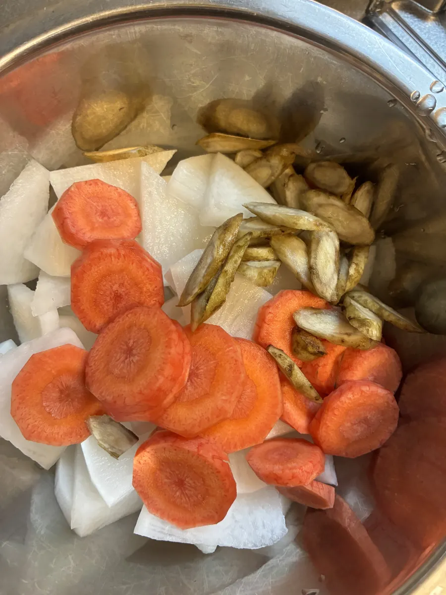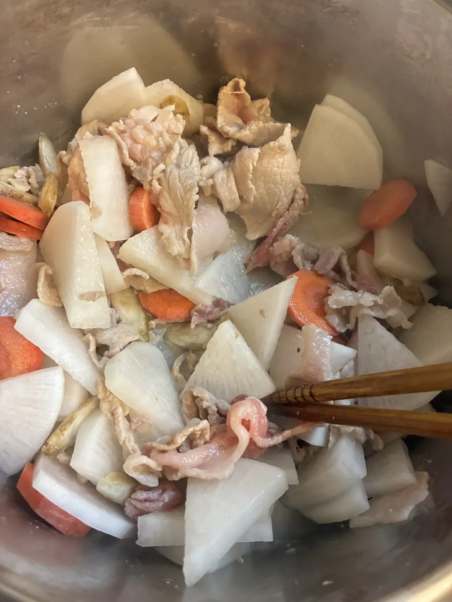 冷蔵庫の野菜(大根、人参、さつまいも、ごぼうなど。食べやすい厚さや大きさに切っておく)
