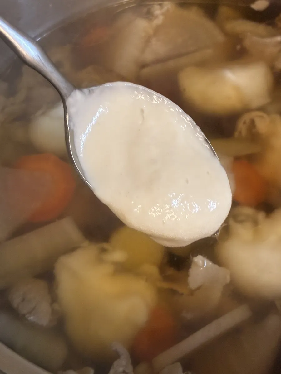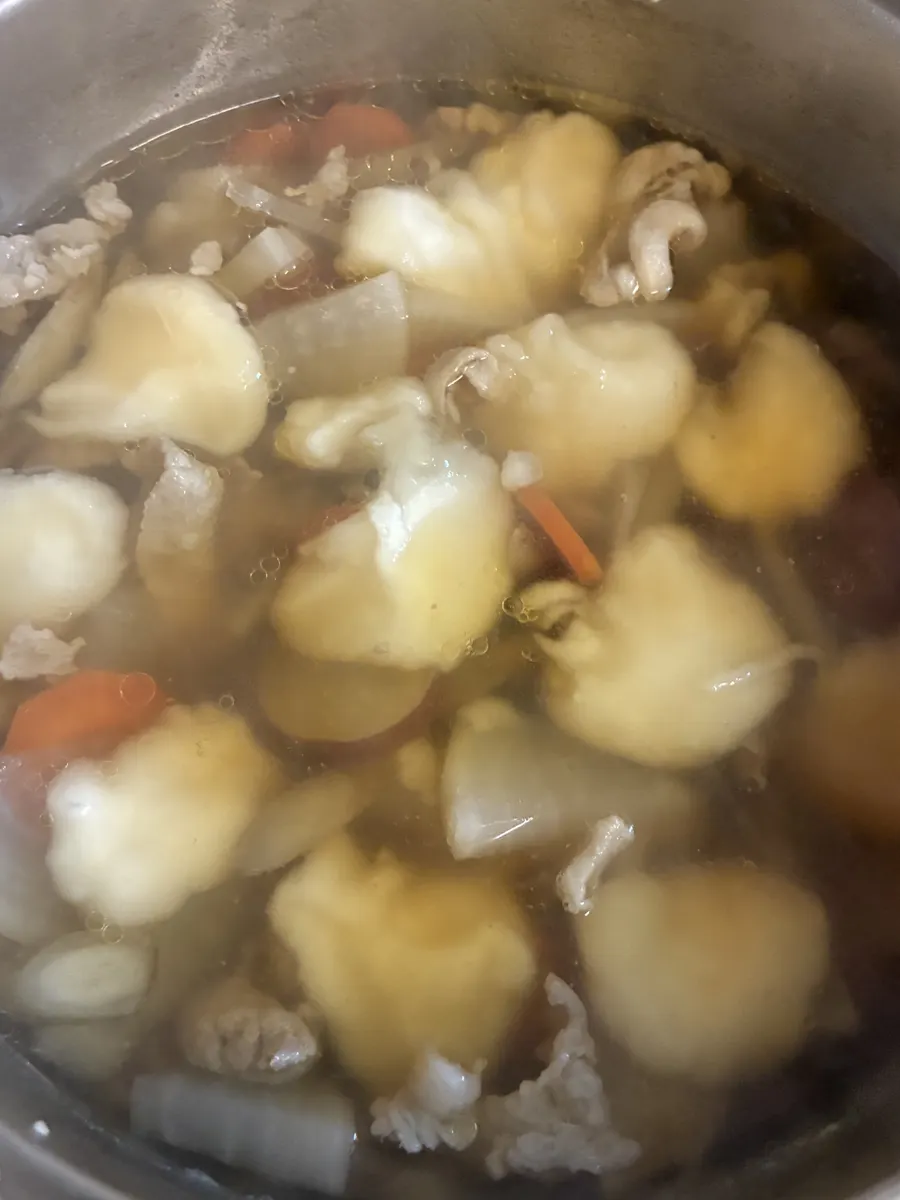 ④煮込んでる間にボウルに薄力粉、片栗粉、塩、水を入れてよく練り、③の鍋にスプーンでポトンと落としていく。