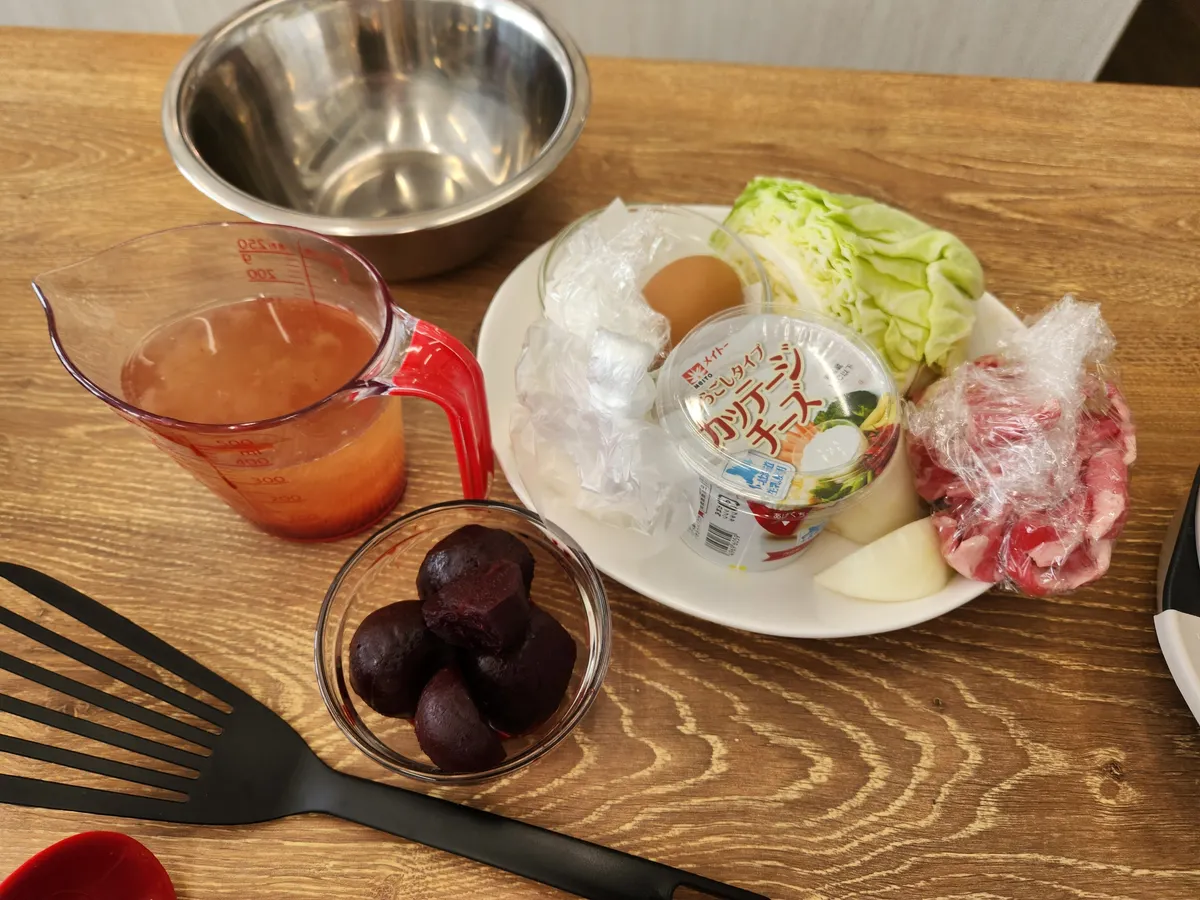 材料(キャベツ、玉ねぎ、水煮のビーツ、牛肉)を切って、だし汁を混ぜて600W2分加熱、全体を混ぜて600W2分を計3回で出来上がり💕最後にプレーンヨーグルトを混ぜて仕上げました💮