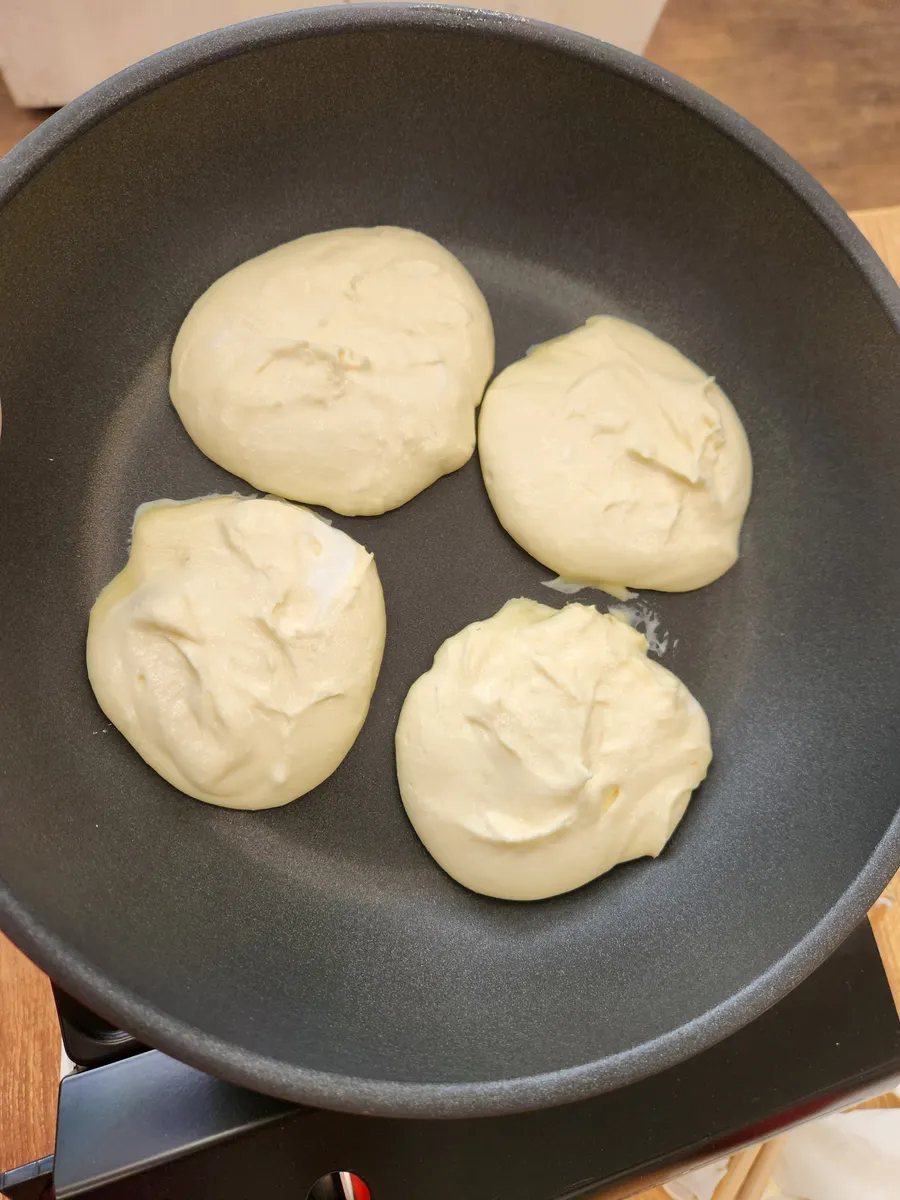 ロシア風パンケーキは、カツテージチーズ、薄力粉、卵、ボールに混ぜて、油をしいてフライパンで形を整えながら弱火で5分程焼き色が付くまで焼い裏返し出来上がり💕