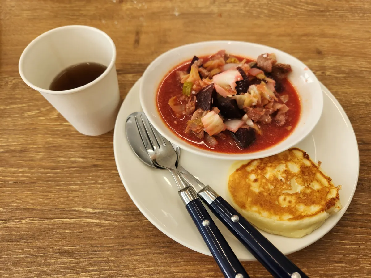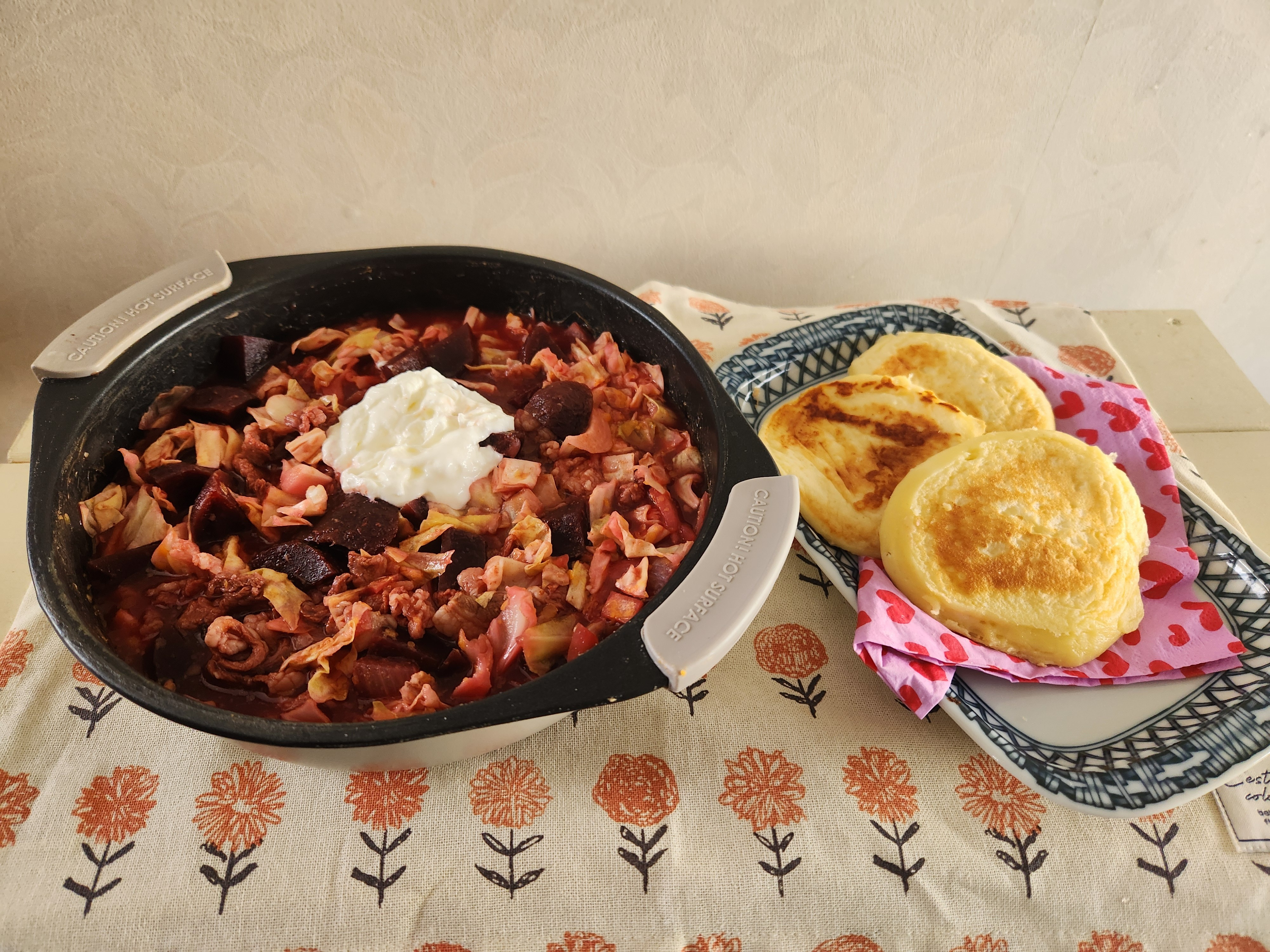 レンジでボルシチとロシア風パンケーキ作って来ました✨