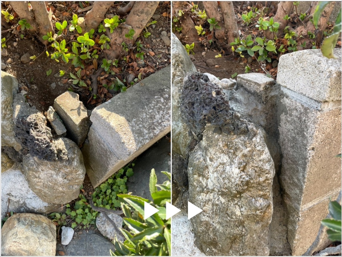 ↓ブロック塀と石の間がスカスカなので、コンクリ端材や小石を噛ませながら、モルタルを埋めてゆきます。
