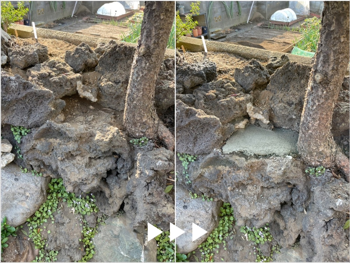 ↓花崗岩積み上げてる途中に棚代わりにモルタルを均しました。