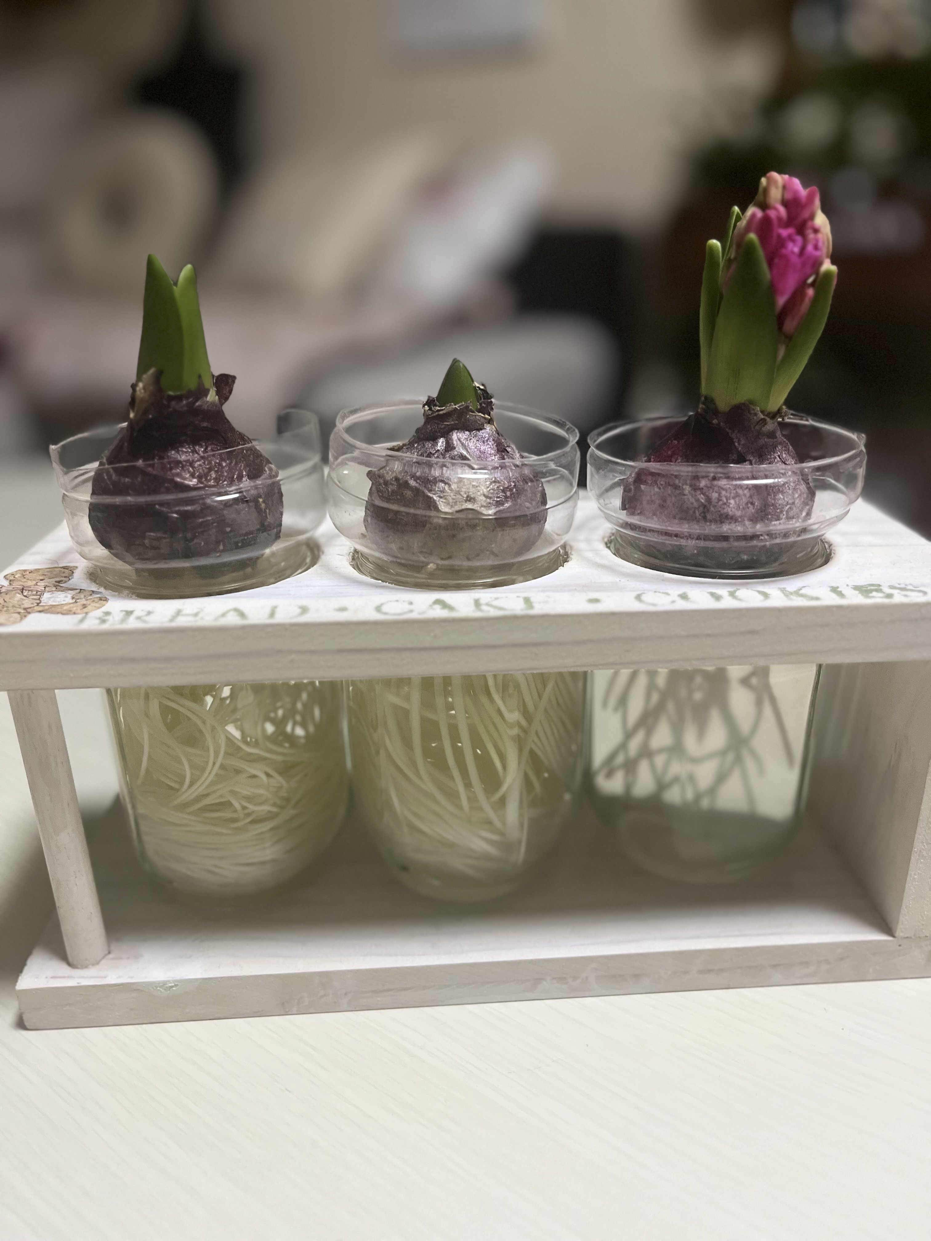 本当はひと回り大きい容器に移してあげれば、水替え管理が楽なんだけど…😅根っこは瓶から出して折れたり、取れちゃったりしても半分以上無くすという暴挙に出ない限り、大丈夫です🙆それは花を咲かせるまでの栄養はすべてひとつの球根に入っているからなんです✨水枯れしないようにすれば、ヒヤシンスって以外と強いんですよ💪