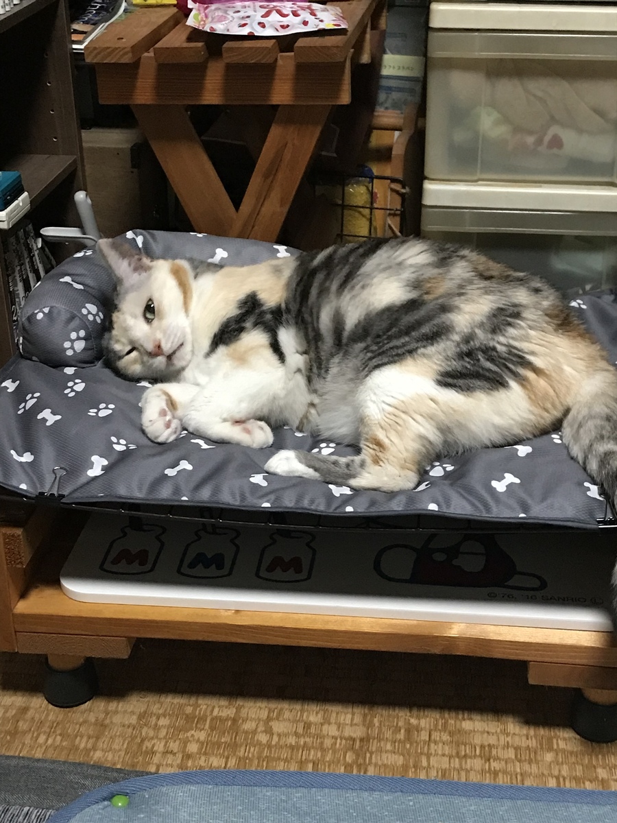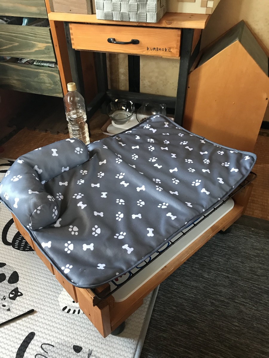 梅雨明け前から、暑い日が続いて猫の暑さ対策を模索していました。以前作ったペットベッドを何とか使えないものかなぁ?と考えて内寸、外寸を測りお買い物。丁度いい大きさの珪藻土マット(サンキ)、ワイヤーネット(セリア)を発見し、保冷剤や凍らせたペットボトルを珪藻土マットの上に置きます。少し高さが欲しかったので、カインズさんで丁度いい太さの垂木を買ってネットの下にかませてから、まち釘で固定しました。