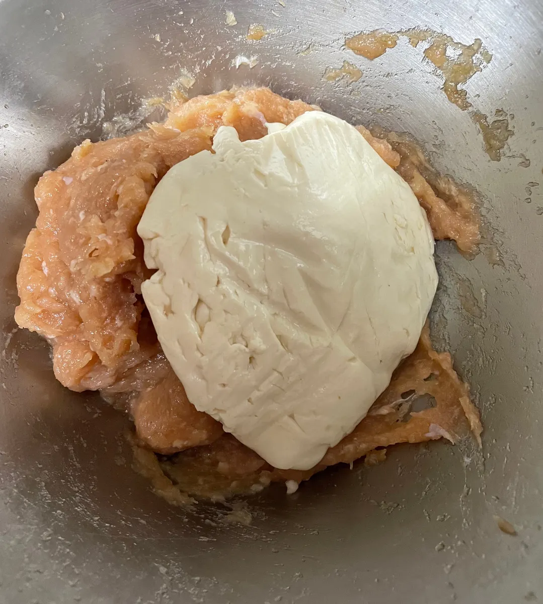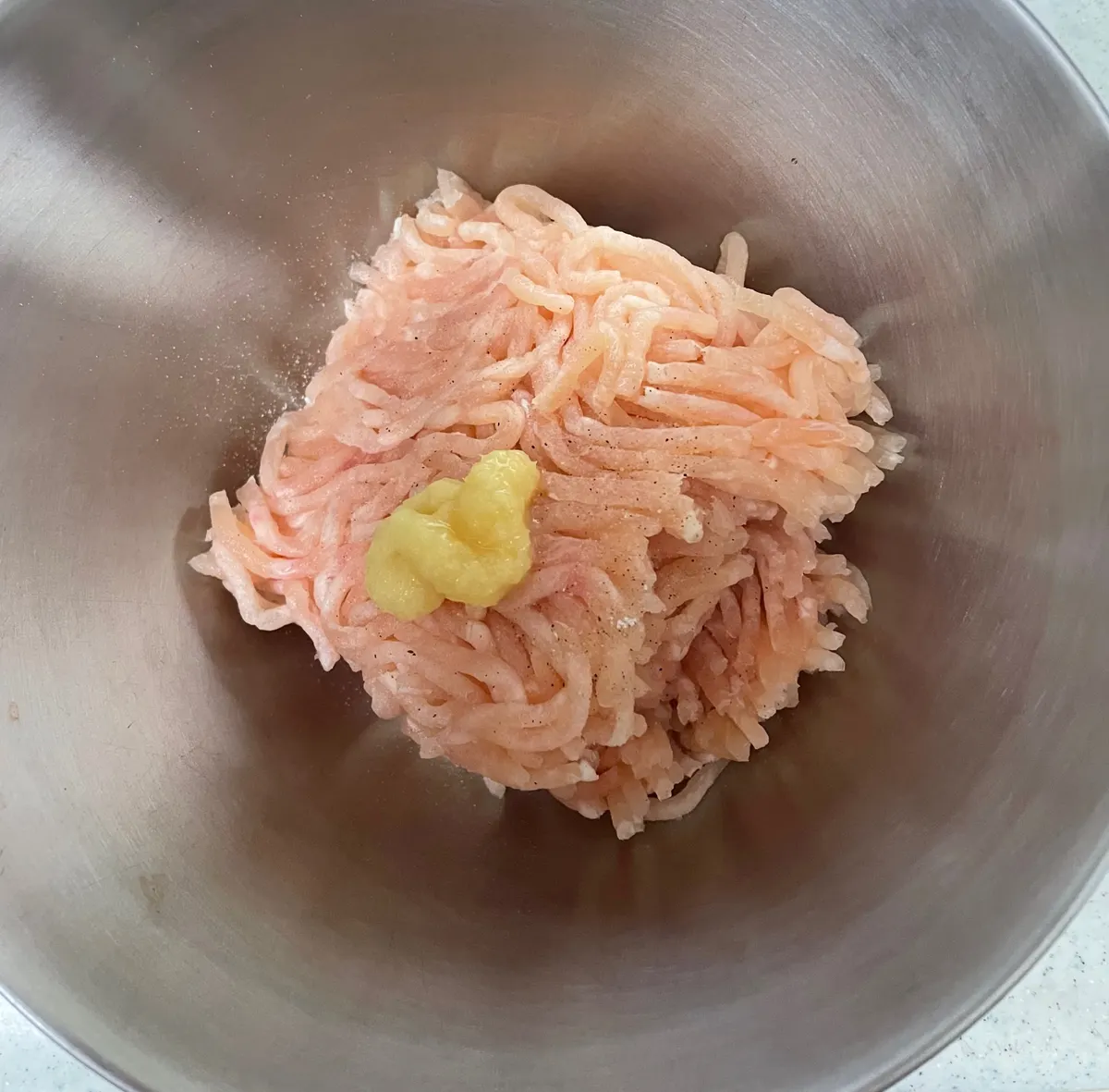 ボールに鶏ミンチ、塩胡椒、しょうがを入れ粘り気が出るまでこねる