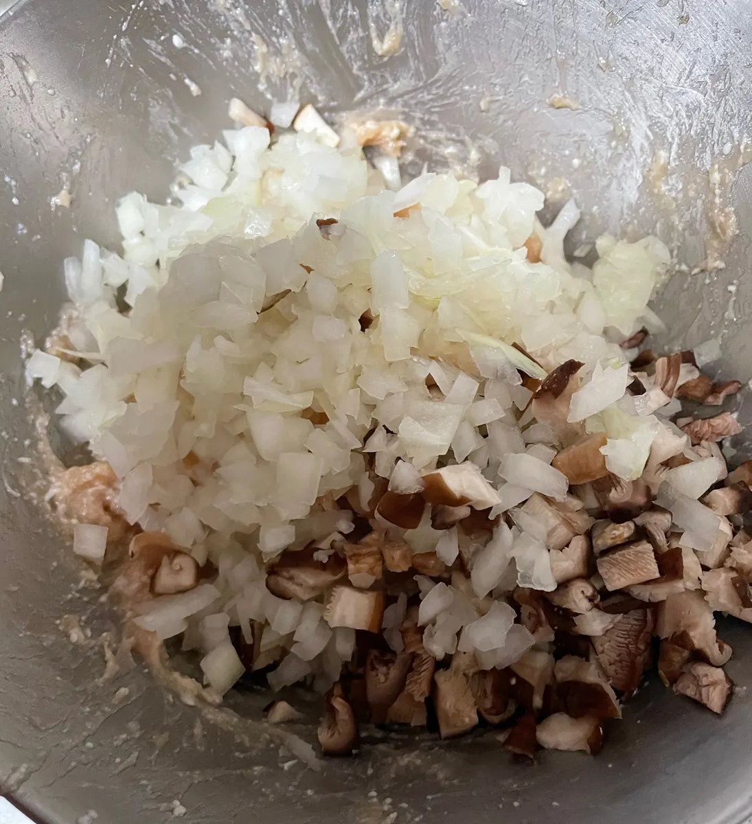 みじん切りした玉ねぎ&しいたけを入れてさらにこねる