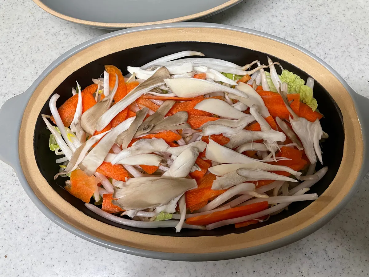 耐熱皿にお野菜をしいて(今回は白菜、にんじん、舞茸、もやしを入れました)