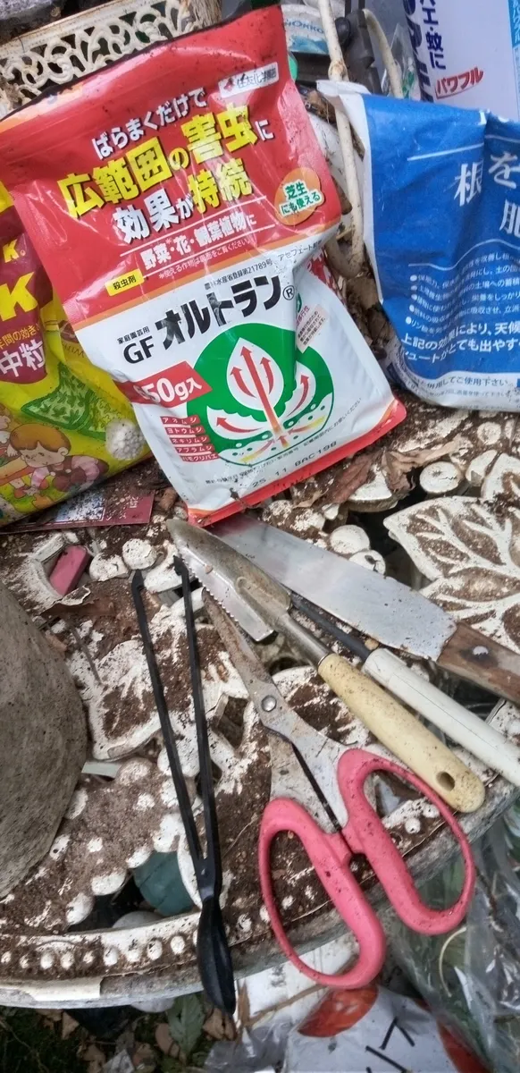 ③ふた回り大きい鉢に、培養土とオルトラン、マグアンプK、根を育てる肥料を入れ混ぜ合わせておきます。