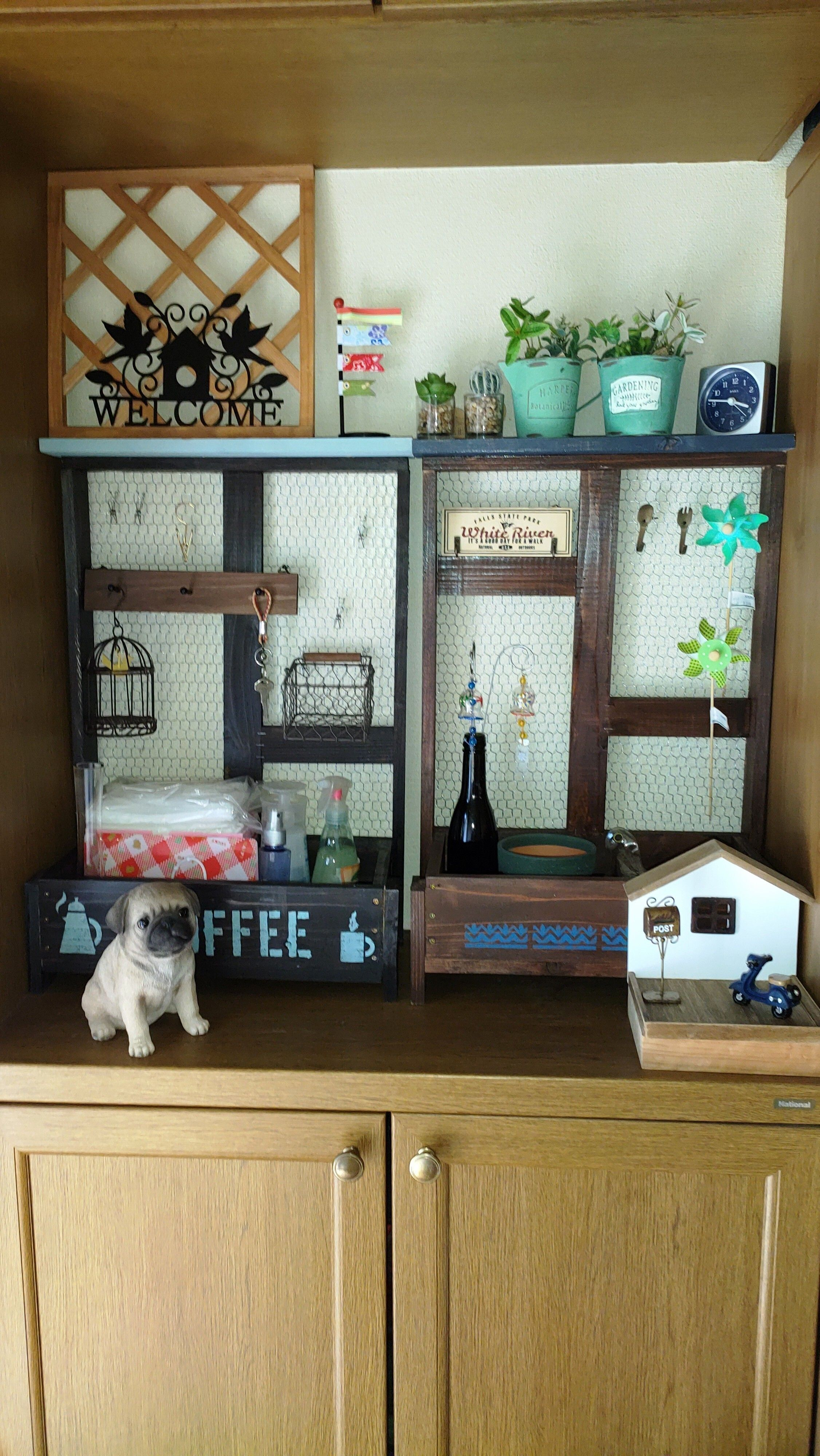 投稿を表示玄関が可愛くなりましたね。一気に2つ作って並べたらシンデレラフィット❣️ワイヤーに色々引っ掛けて使えるのも便利ですね。外に置く事ばかり考えていたので、こういう使い方も出来るという事が分かり参考になりました😃