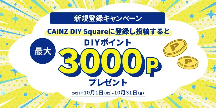 期間中にCAINZ DIY Squareに新規登録いただいた方には、登録時に新規登録ポイントとして1,500DIYポイントを付与いたします。(通常500DIYポイント)