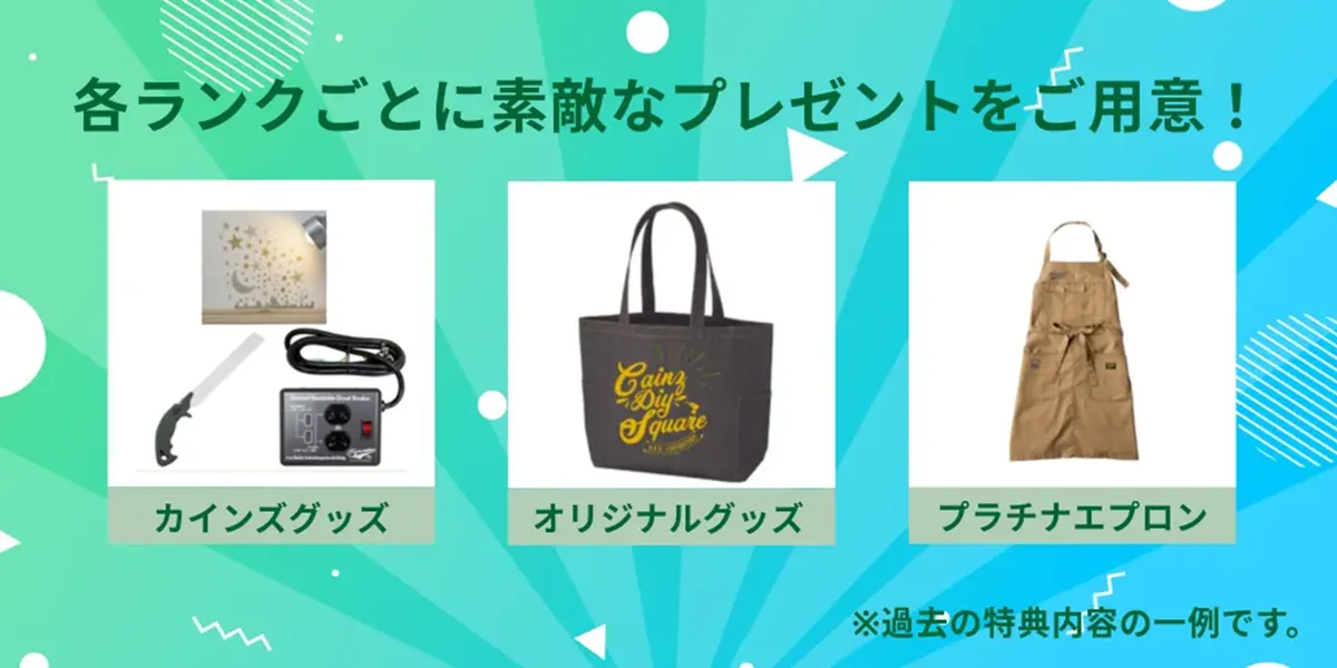 ※「DIYポイント」はカインズ会員ポイントとは異なります。お買い物にはご利用いただけませんが、累計ポイントに応じてランクアップし、ランクに合わせた特典を受けることができます。