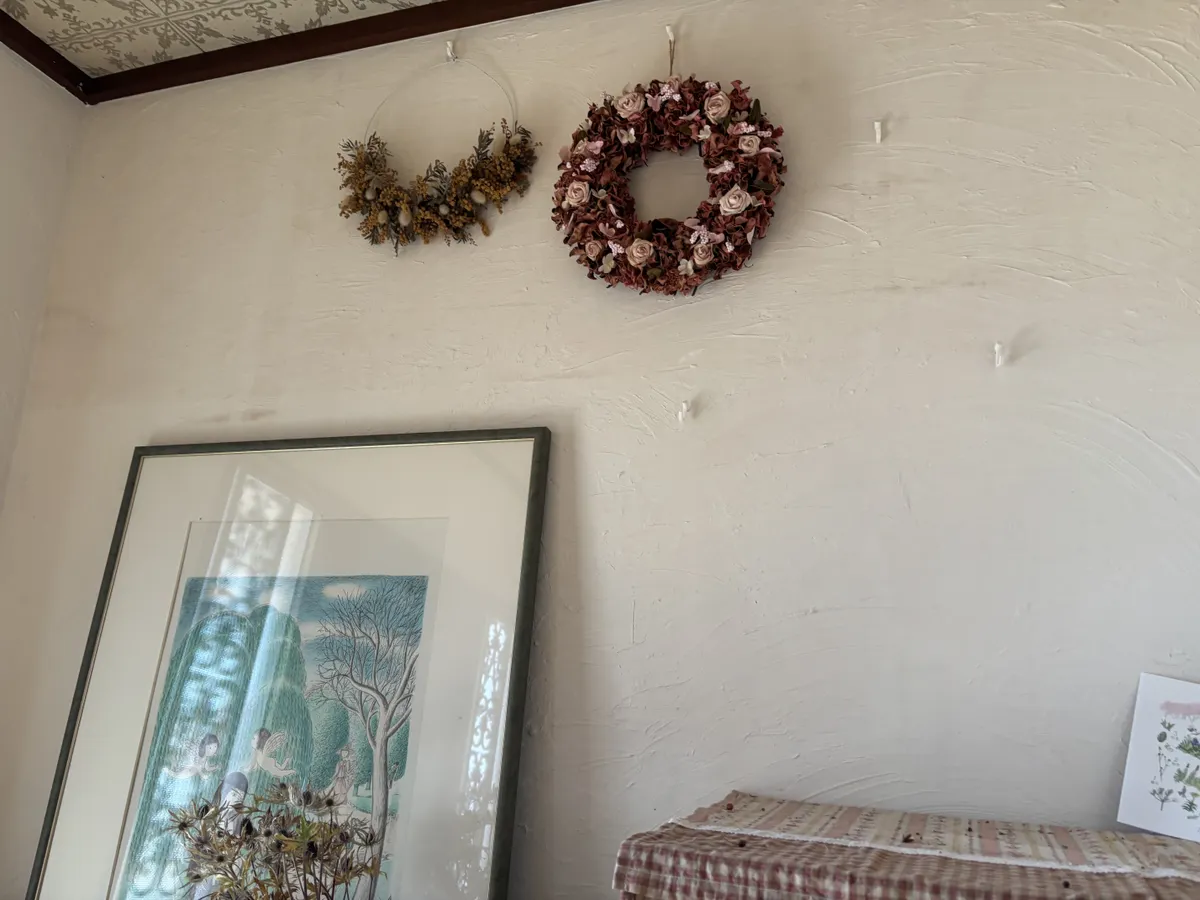 リースやリトグラフなど白い壁に色々と飾って楽しみました。