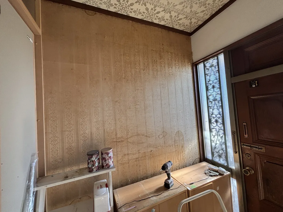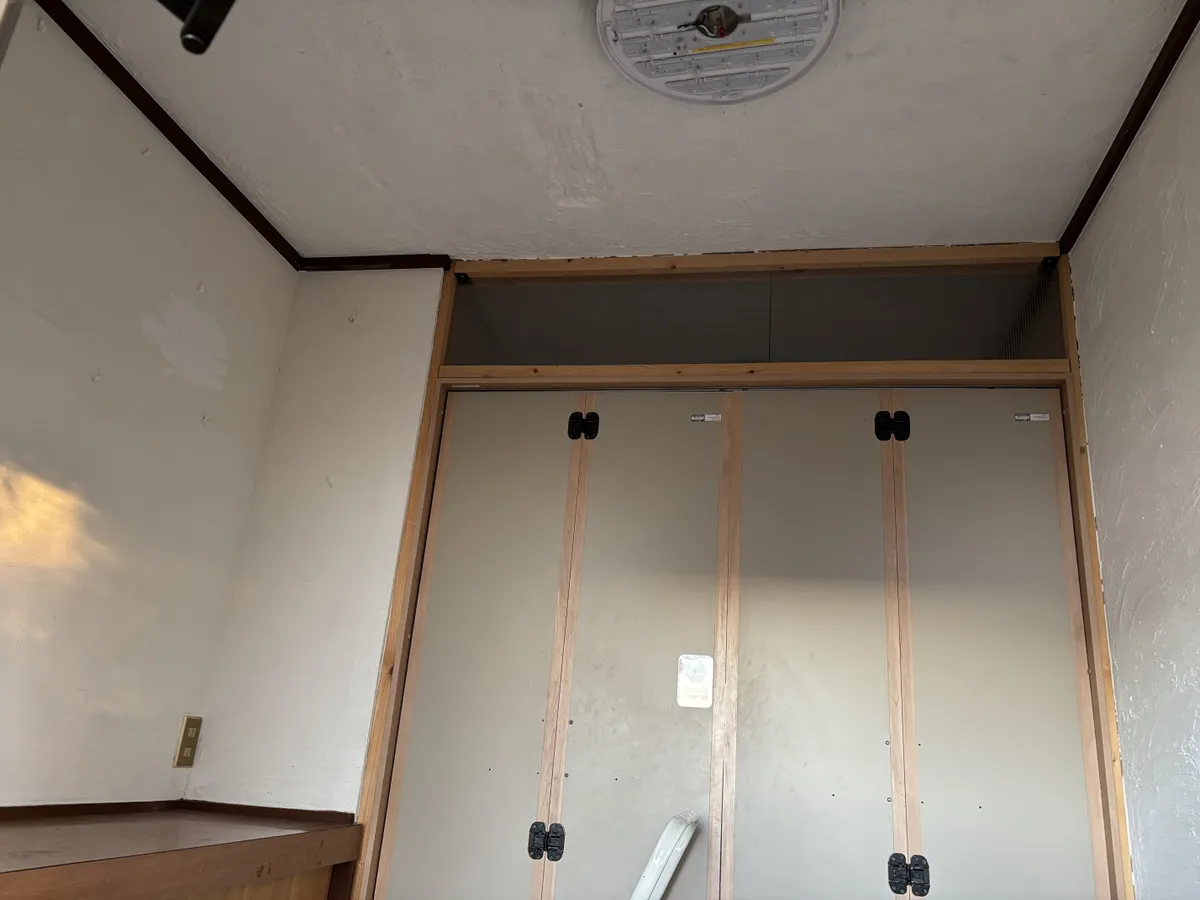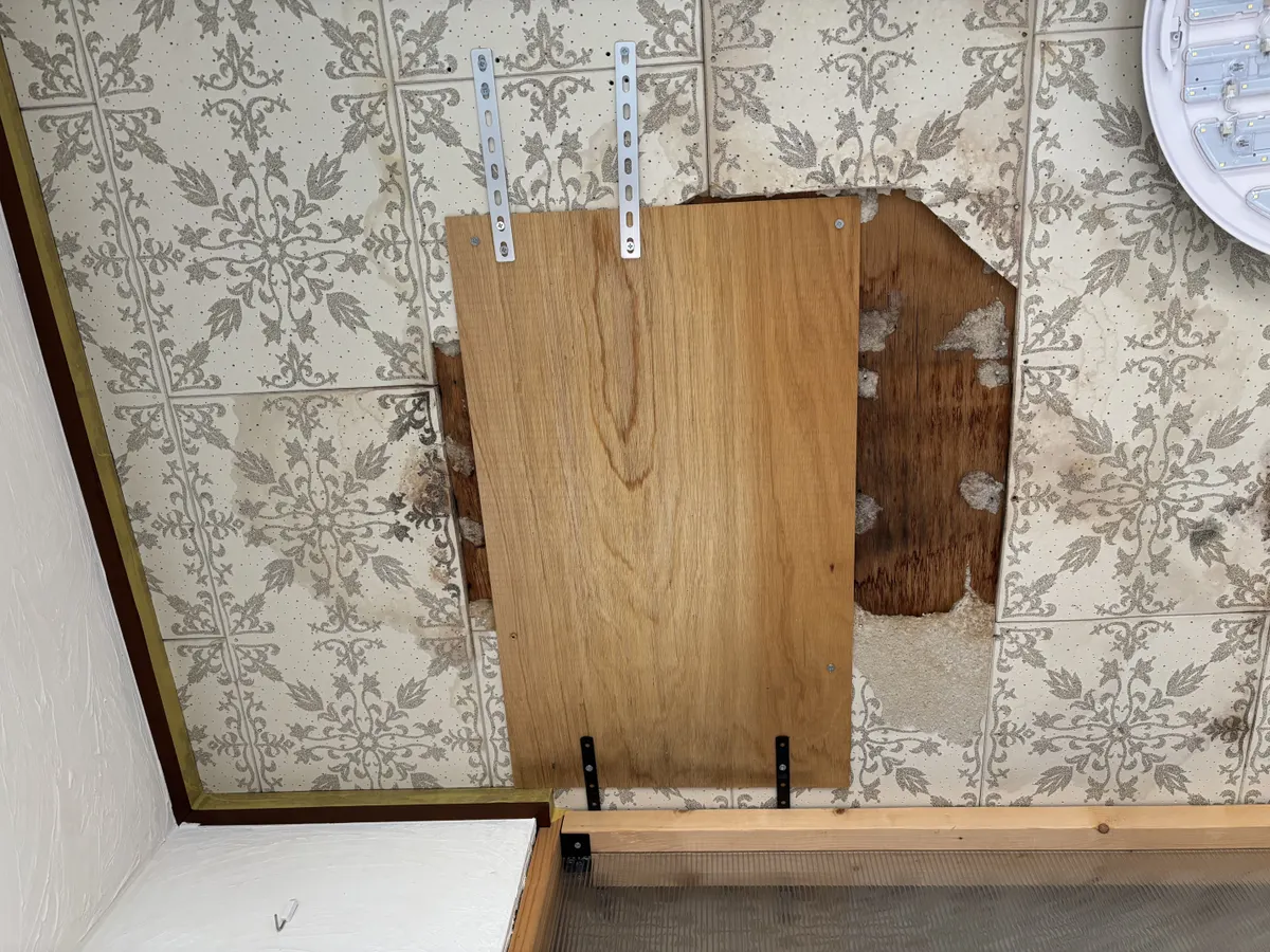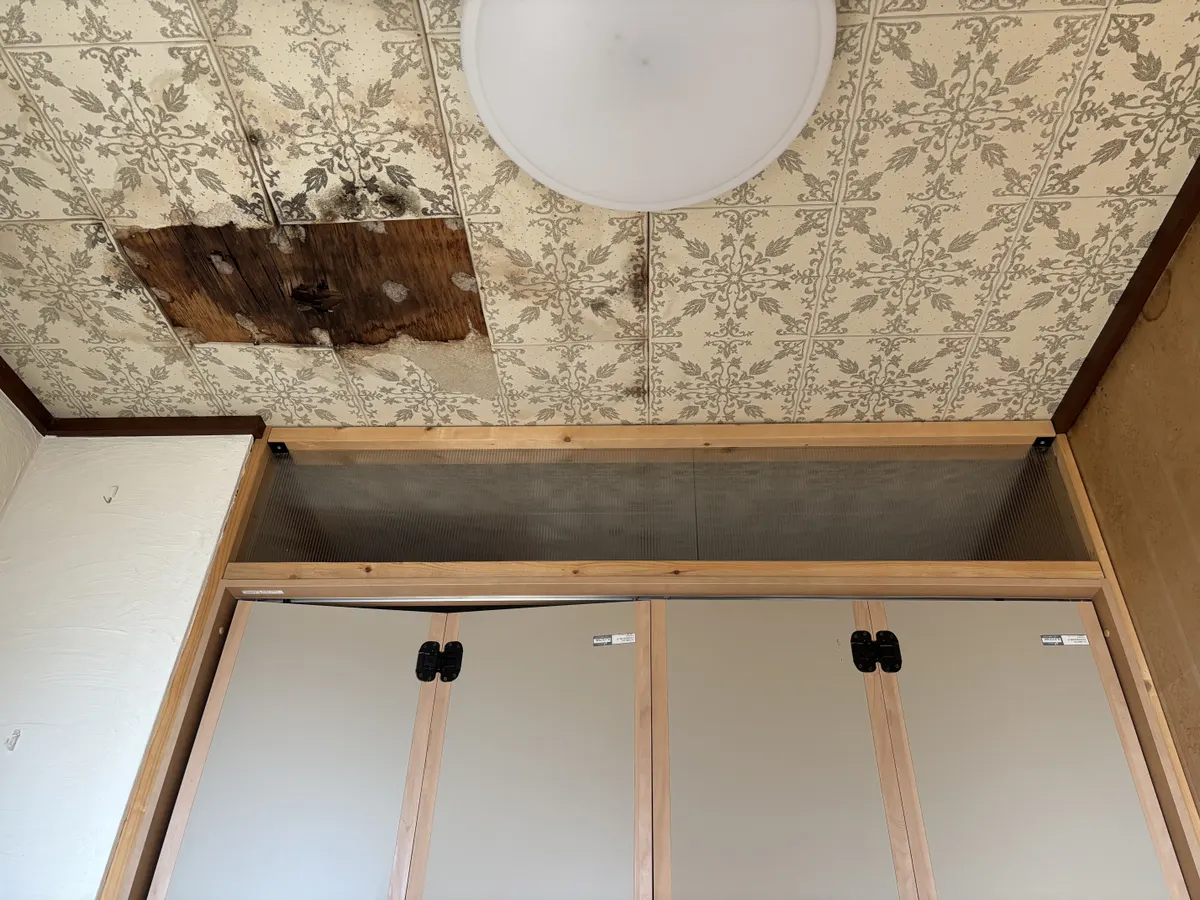 当日は天井板がグズグス、なのを50円のベニヤを小さいサイズだけど無理矢理貼り付けて。