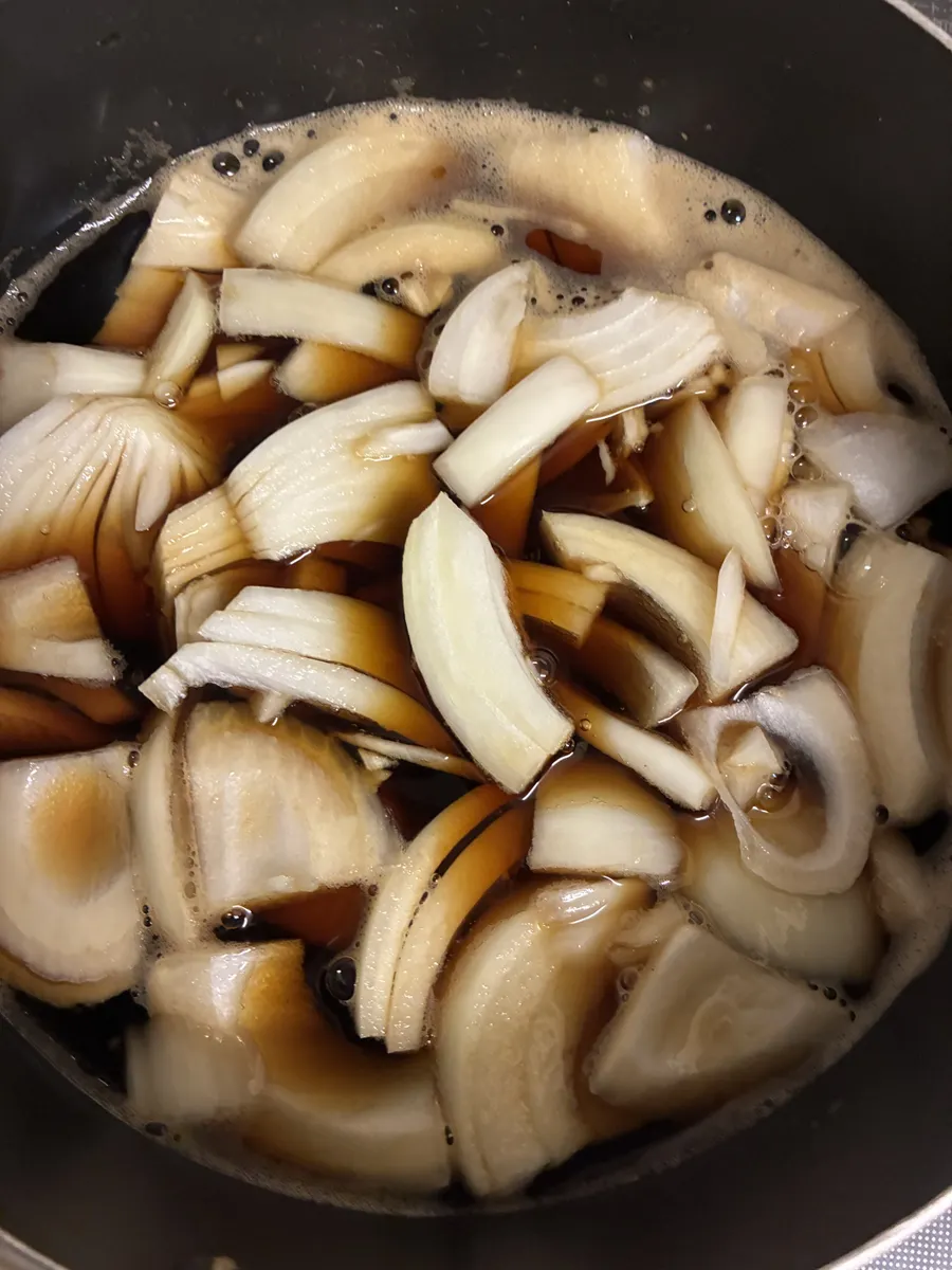 ②鍋に水と・の調味料を入れ煮立ったらタマネギを入れ5分ほど煮る。