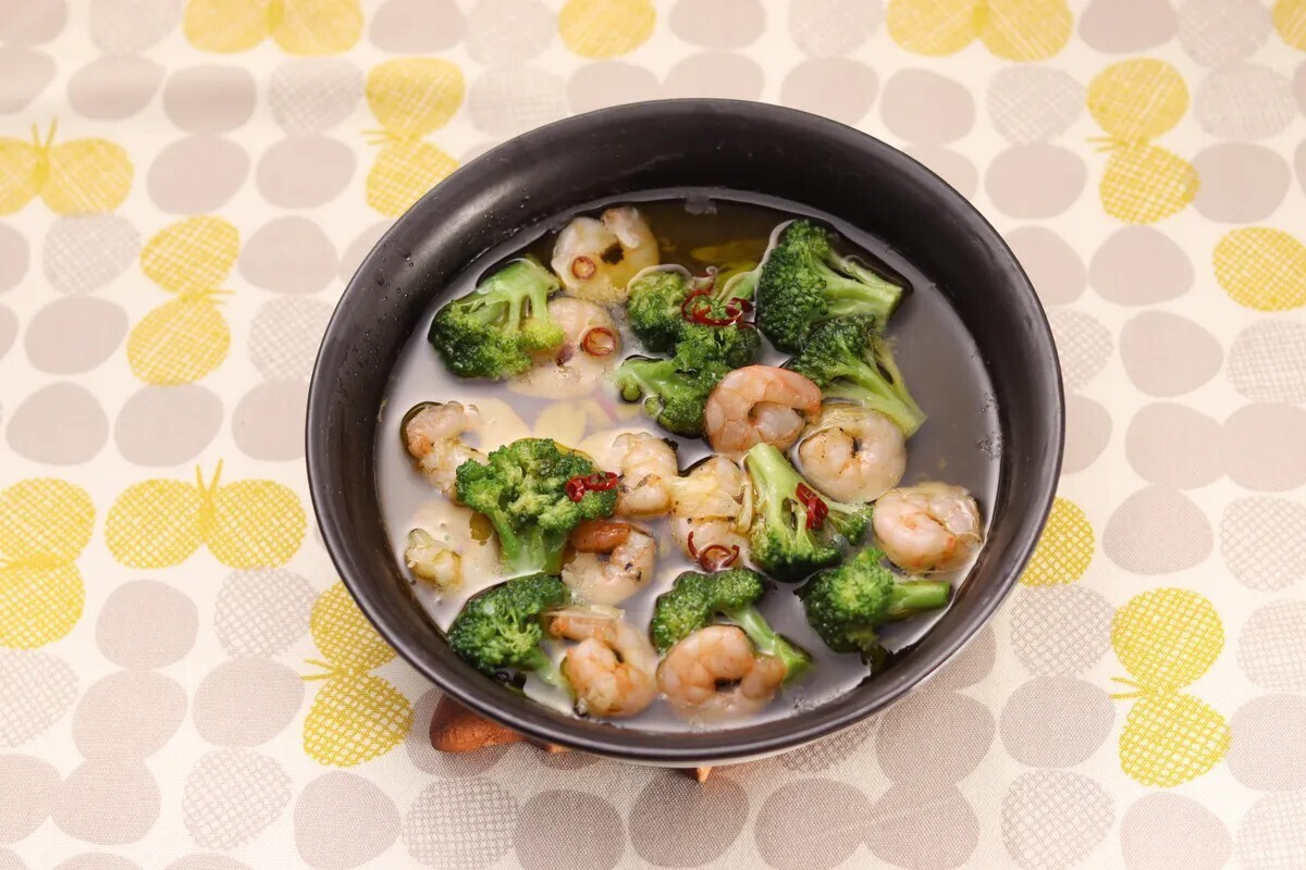 レンジで楽チンプレートにブロッコリー、むきえび、にんにく、赤唐辛子を入れ、オリーブオイルを回しかける。 | |||