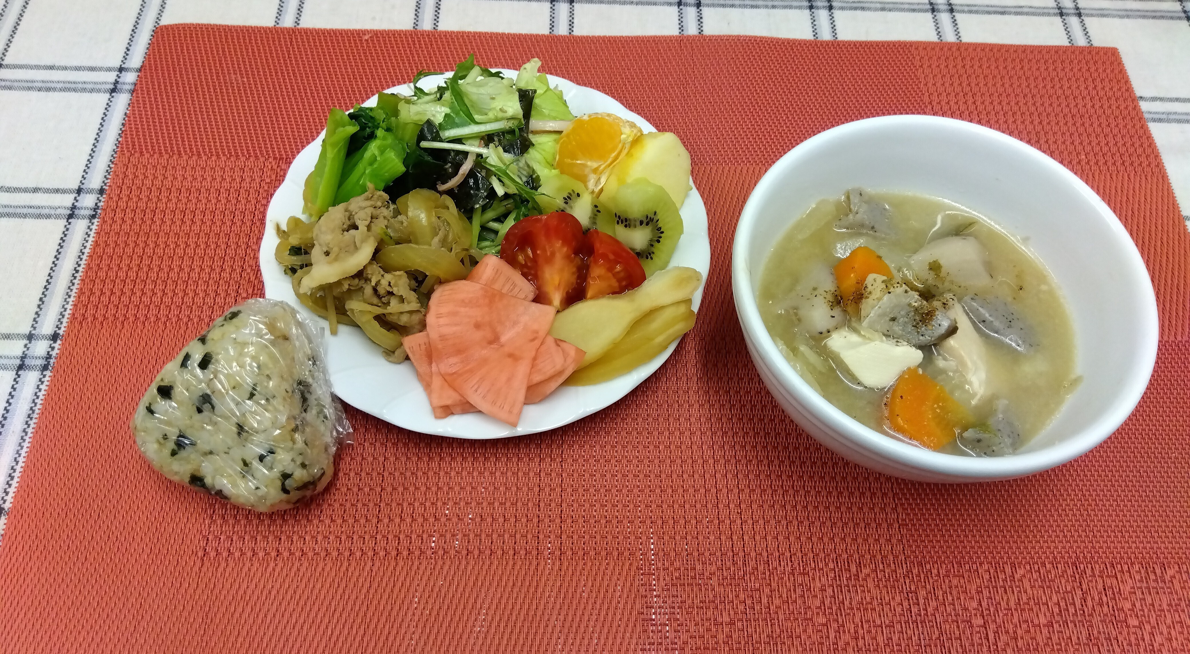 ぶりの粕汁(ぶりの切り身、聖護院大根、にんじん、里芋、レンコン、ゴボウ、白菜、ネギ、お豆腐、こんにゃく)、豚肉と玉ねぎともやしの炒め物、ふりかけ入り玄米おにぎり、生野菜、小松菜の茹で菜、新生姜と赤かぶのらっきょう酢漬け、フルーツはりんごとキウイとみかんです