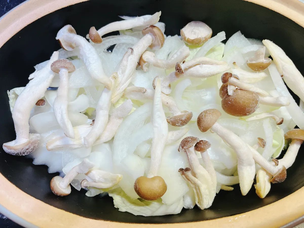 白菜の芯は削ぎ切りにし、パスタポットに敷いて薄切りにした玉ねぎ、しめじをのせます。