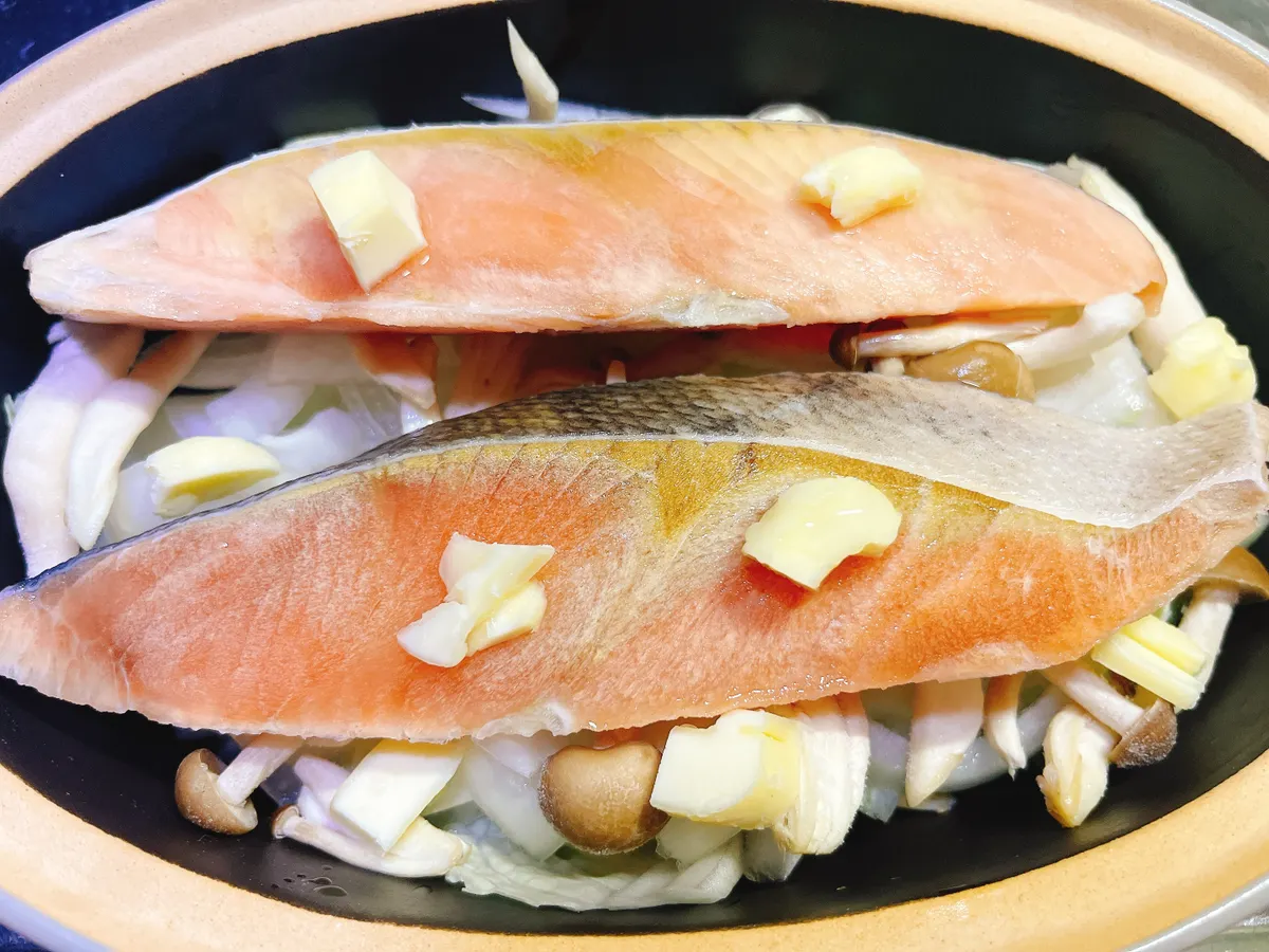 いつ買ったか覚えてない冷凍の鮭を上にのせ、バターを細かくして散らばせます。